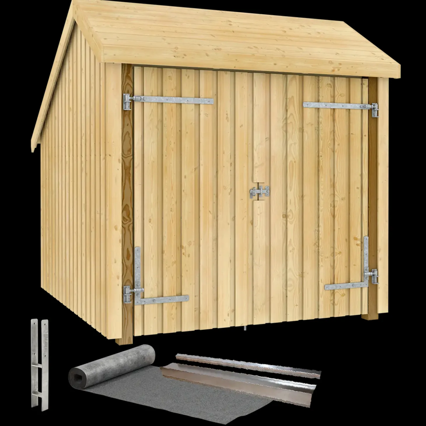 Praktisk skur der er fremstillet af ubehandlet nåletræ og med trykimprægneret, høvlede stolper. Ønsker du at forlænge levetiden og beskytte skuret på bedst mulig vis, anbefales det at du løbende behandler skuret med træbeskyttelse. Du kan med fordel sætte dit personlige præg på skuret ved at vælge en træbeskyttelse der fremhæver træs farve.