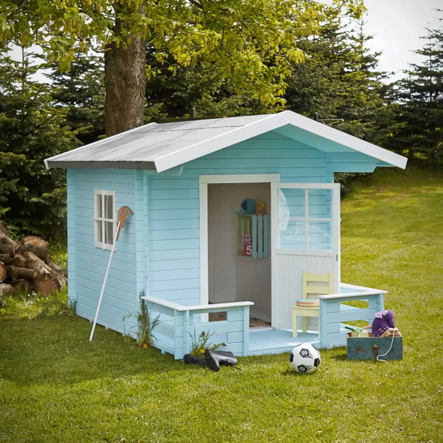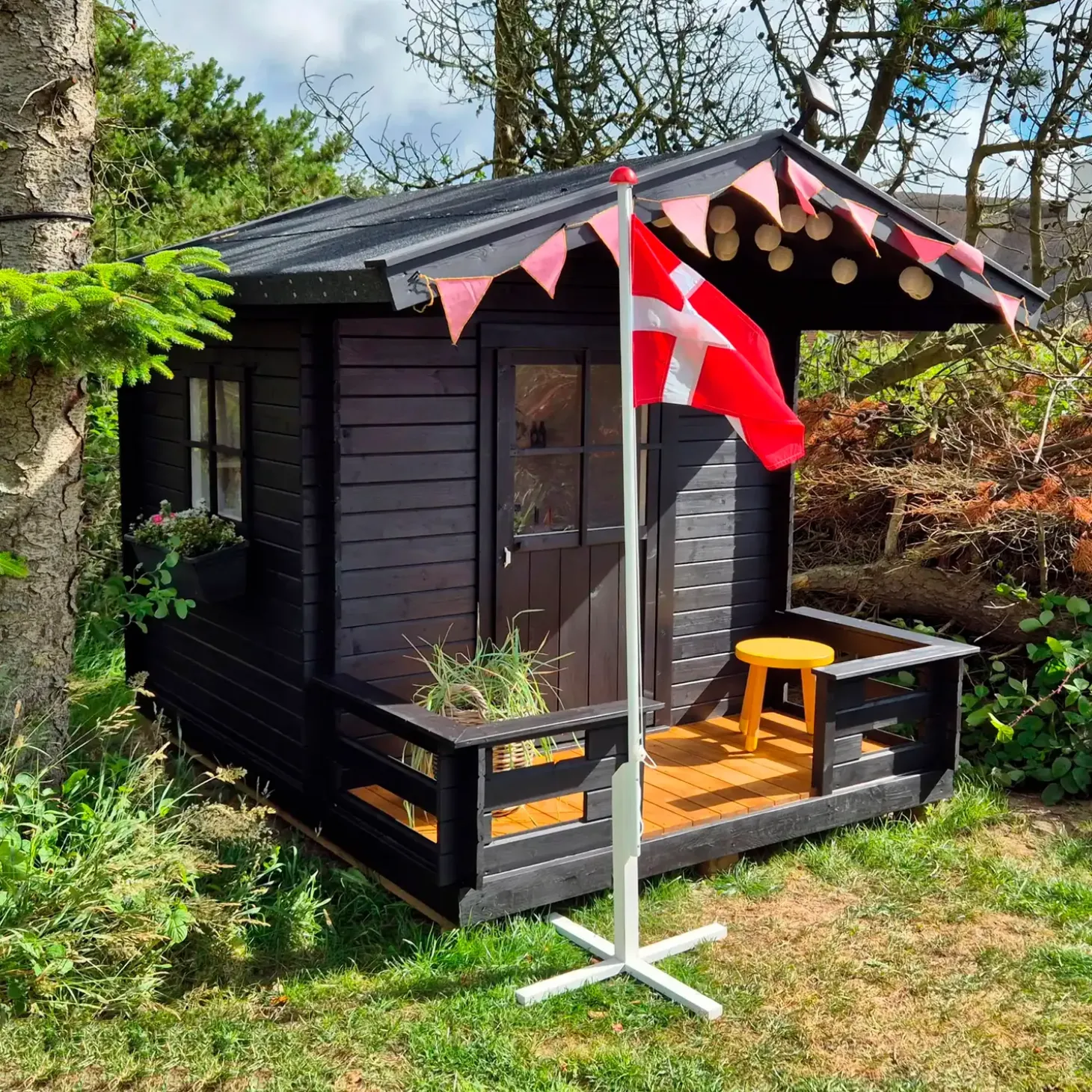 Giv børnene deres helt eget legehus i haven, hvor der er plads til mange timers leg. Legehuset er inkl. en lille terrasse, der giver det ekstra meget hygge.