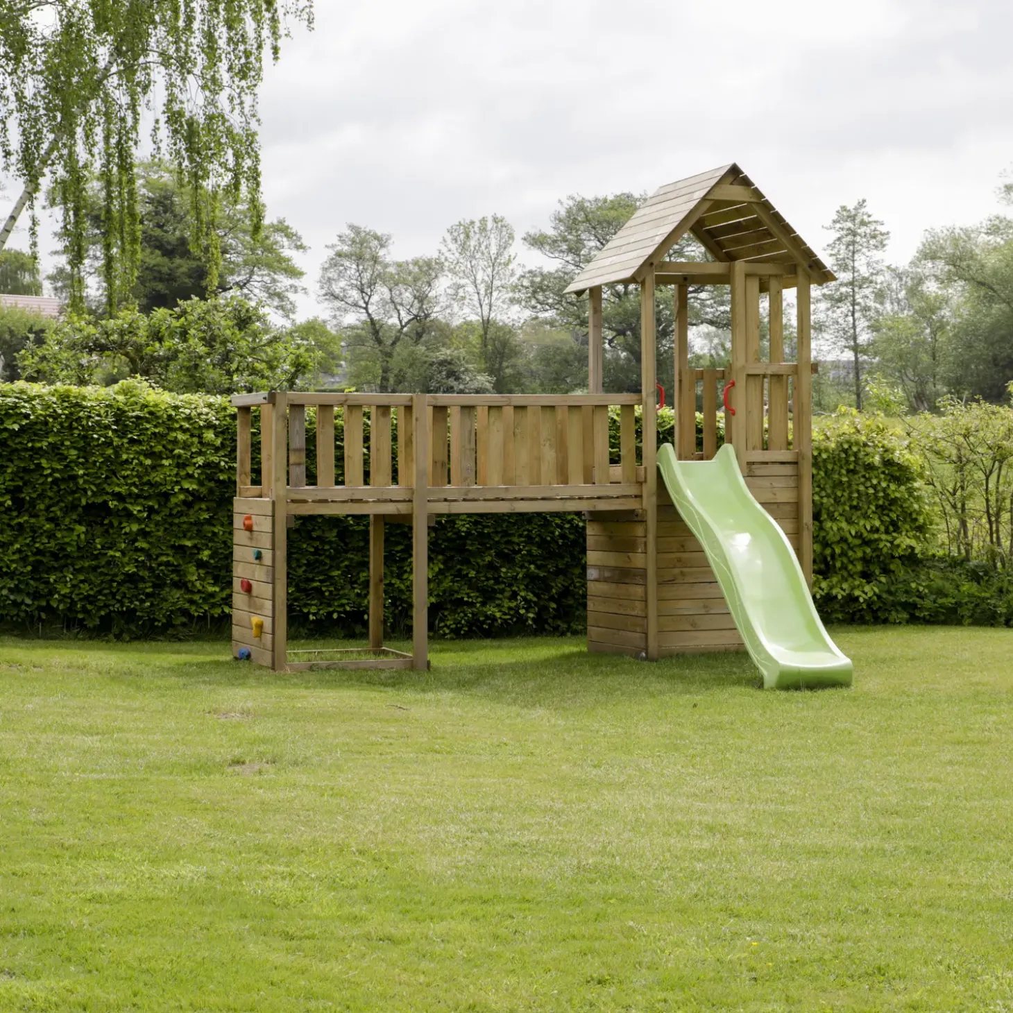 Plus legetårn er fremstillet i trykimprægneret gran i den velkendte kvalitet fra danske Plus. Her får du et legetårn i bedste kvalitet, som børnene vil have glæde af i mange år fremover, og hvor du trygt kan lade dem lege i timevis. Legetårnet er udstyret med stige op til platformen,hvorfra børnene kan tage den grønne rutchebane på nedturen og derefter tage en tur på gyngerne.