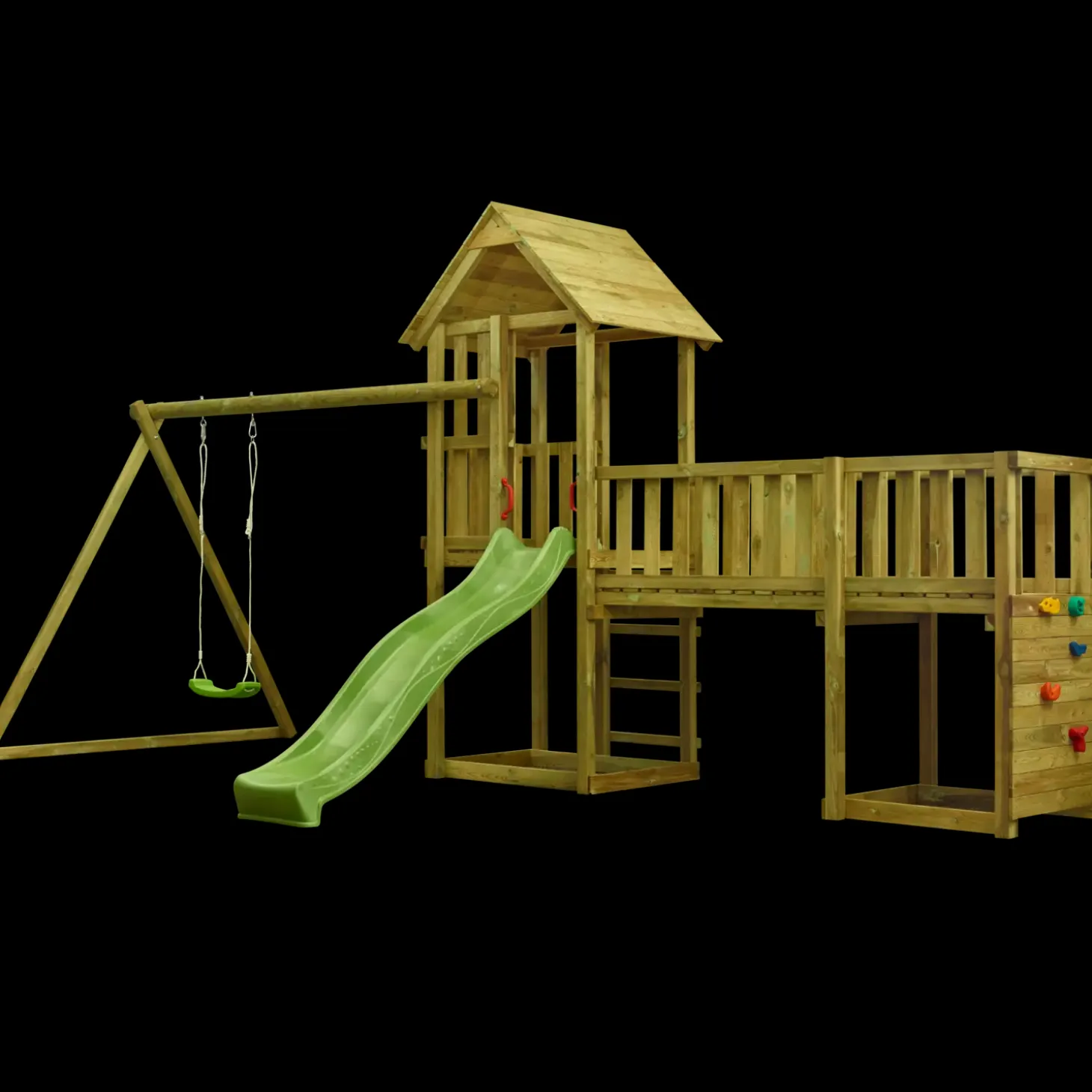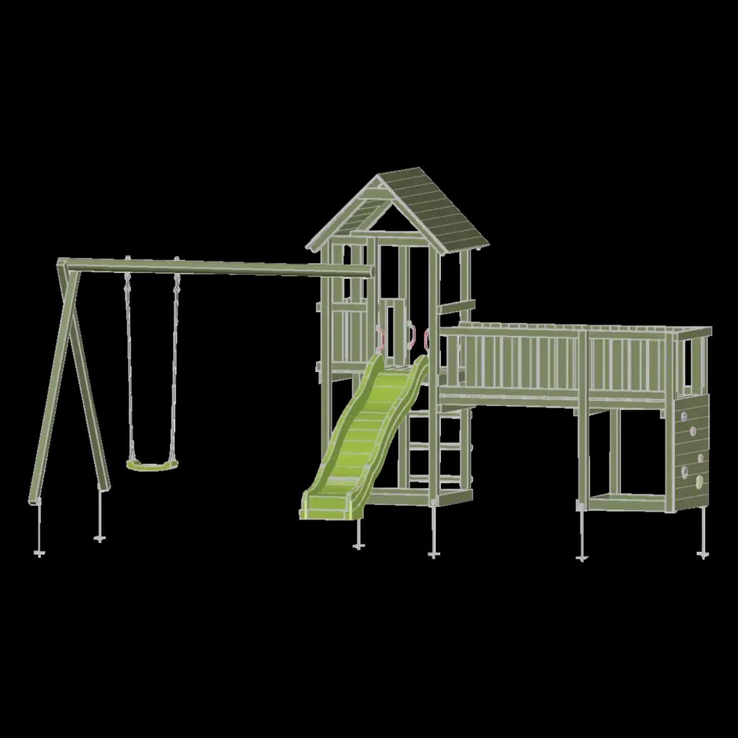 Danskdesignet legetårn med gyngestativ, gangbro og klatrevæg. Legetårnet er fremstillet i trykimprægneret gran, der giver en god modstandsdygtighed overfor vind og vejr. Derudover er det udstyret med en stige op til platformen, hvor børnene kan tage rutsjebanen på nedturen og derefter mærke suset i maverne når de svinger frem og tilbage på gyngerne.