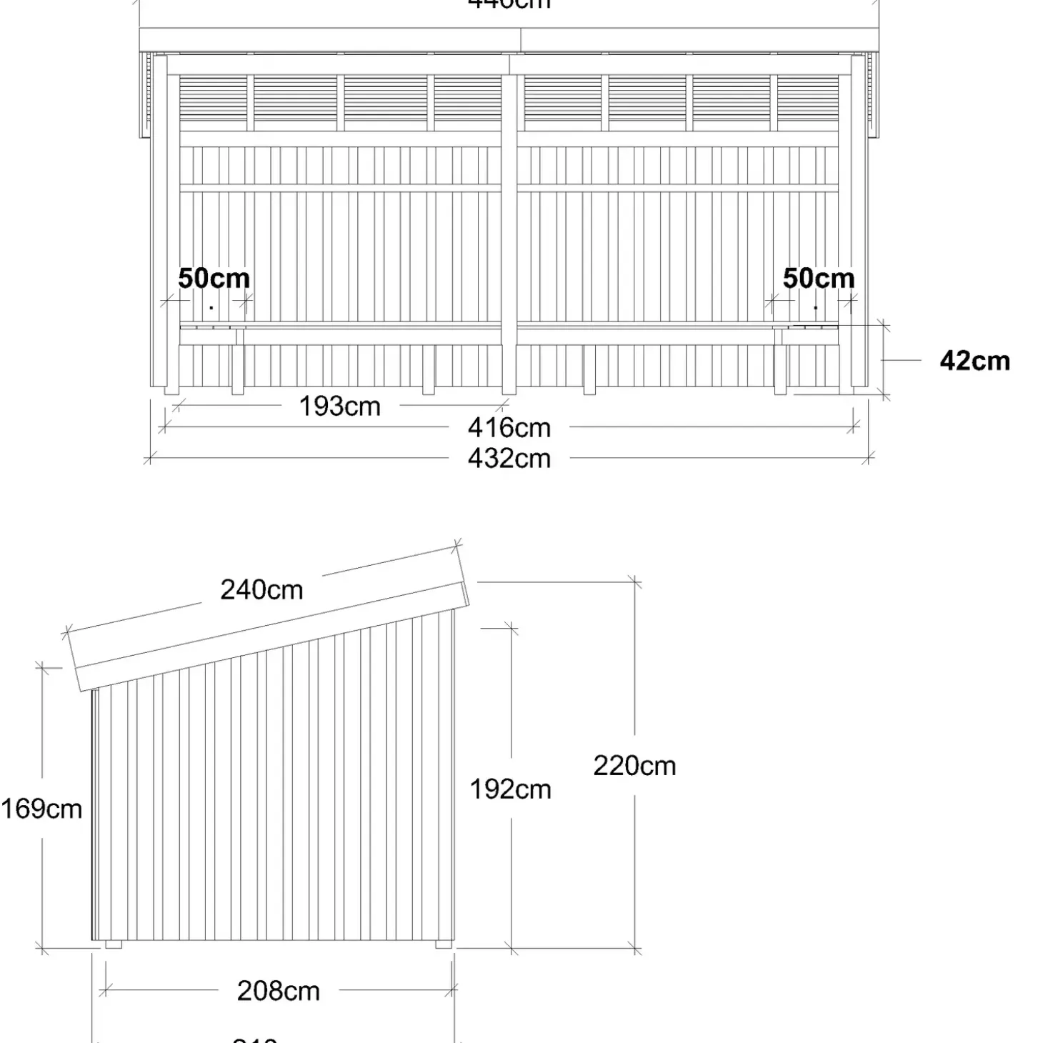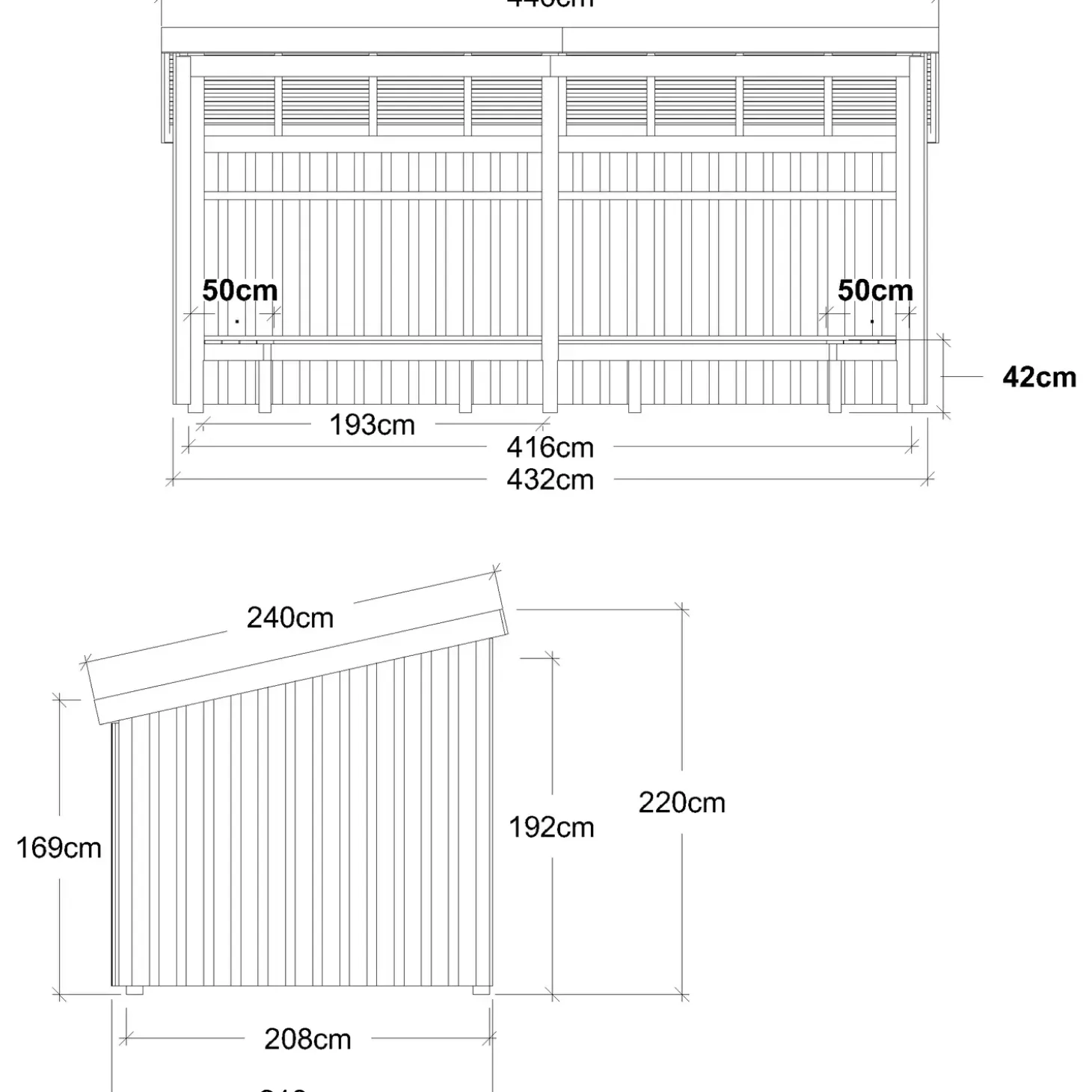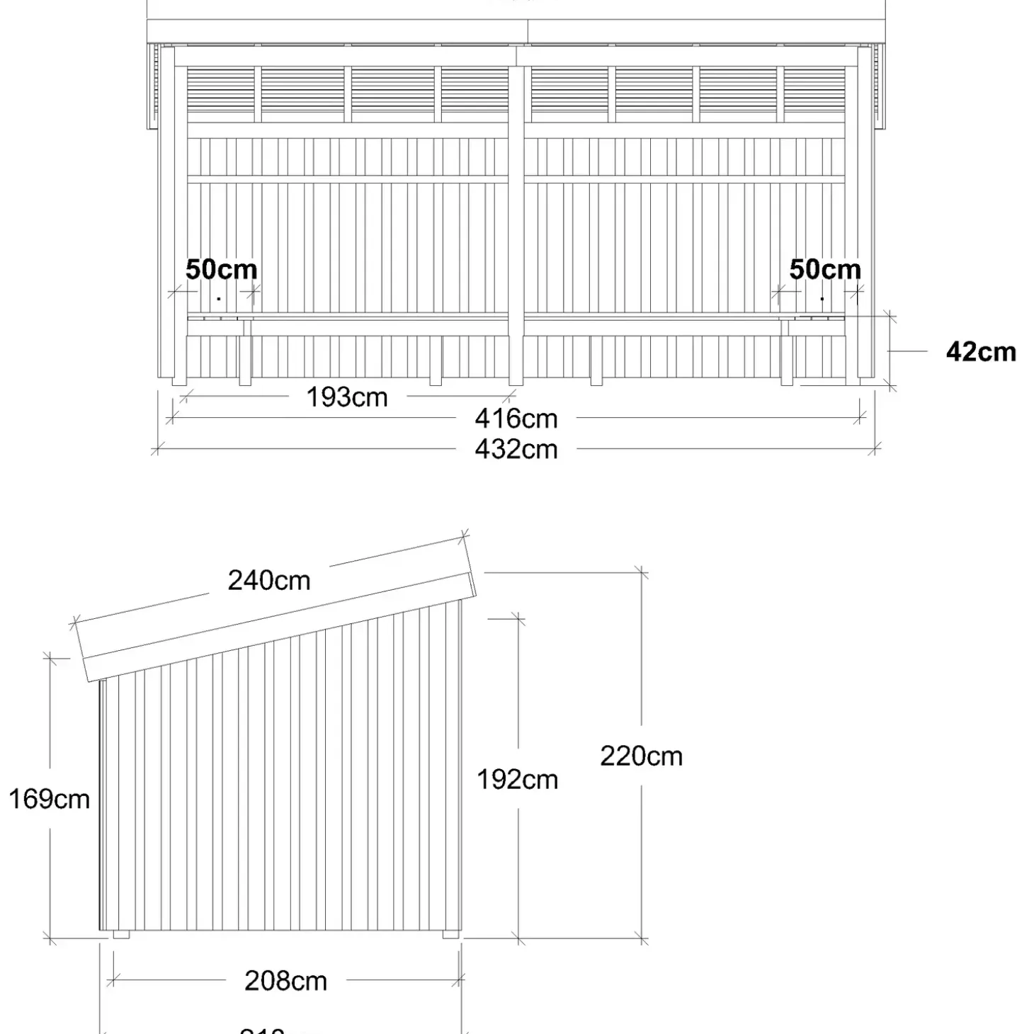 Nordic Bålhytte 2-moduler åben inkl. beslag/skruer og bænk. Ekskl. tagpap/alulister og H-stolpefødder.