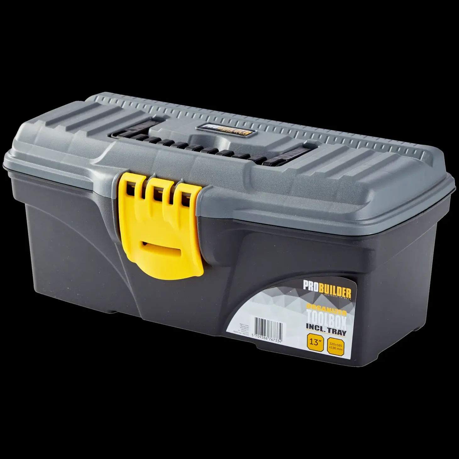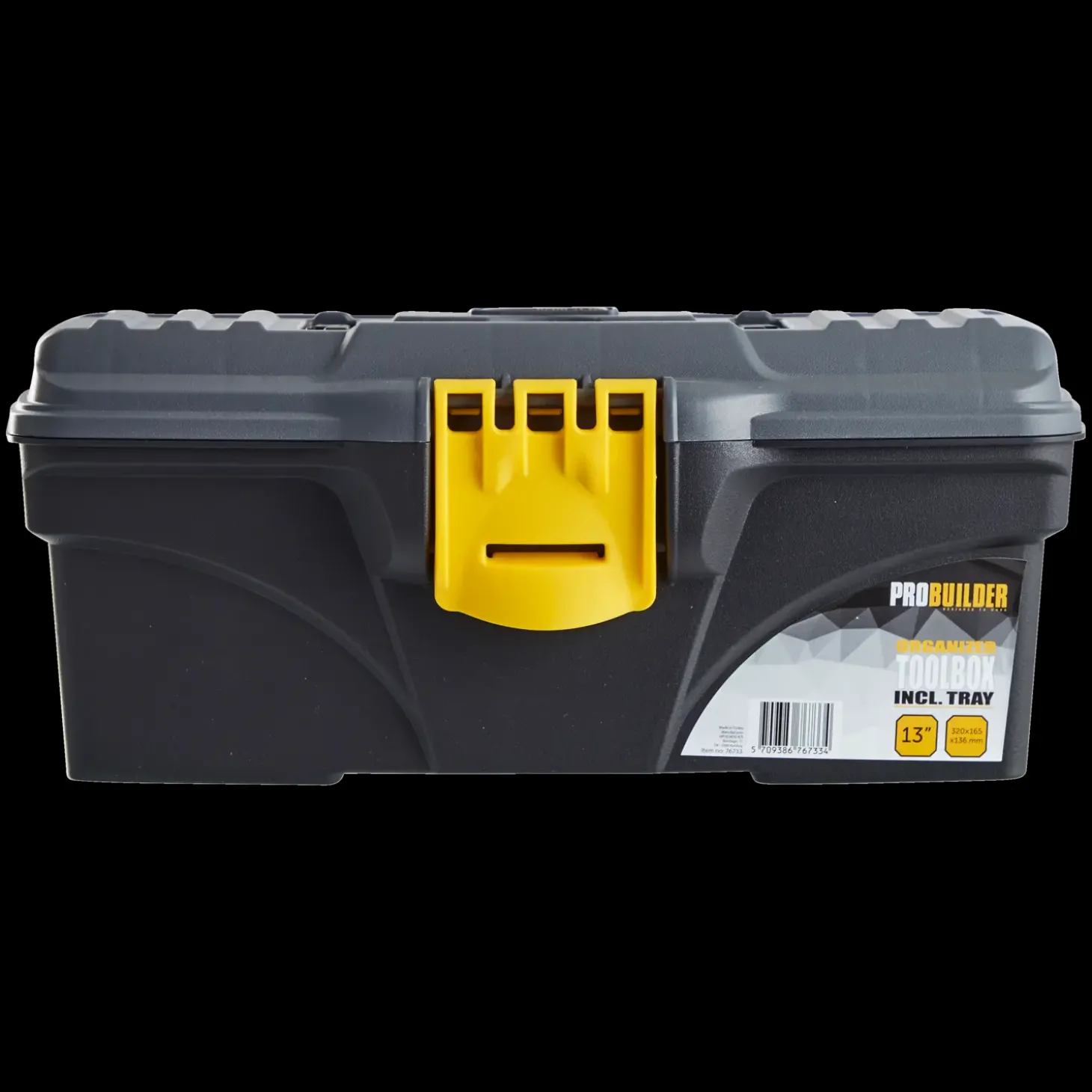 Probuilder 13″ værktøjskasse med løs indsatsbakke, lukkebeslag og nedfældeligt håndtag.