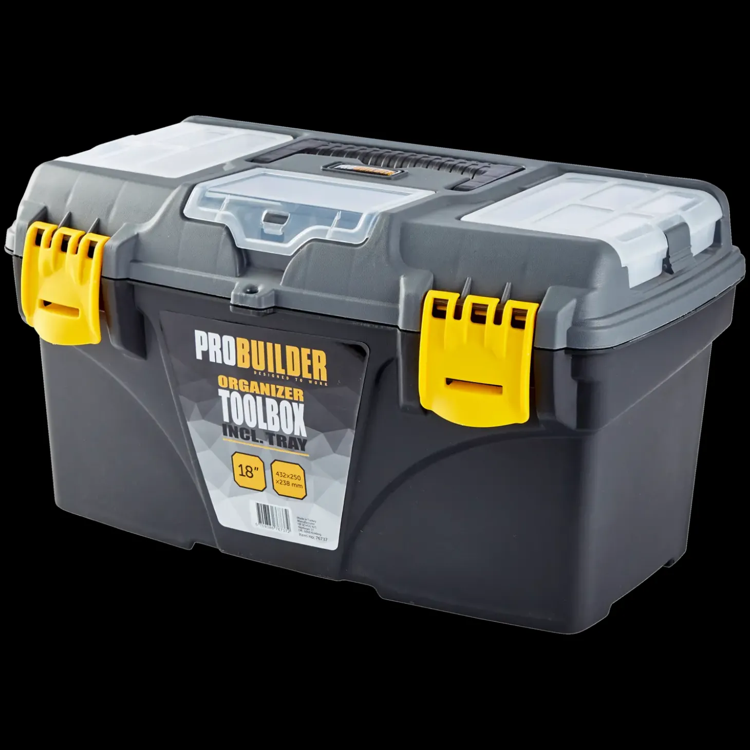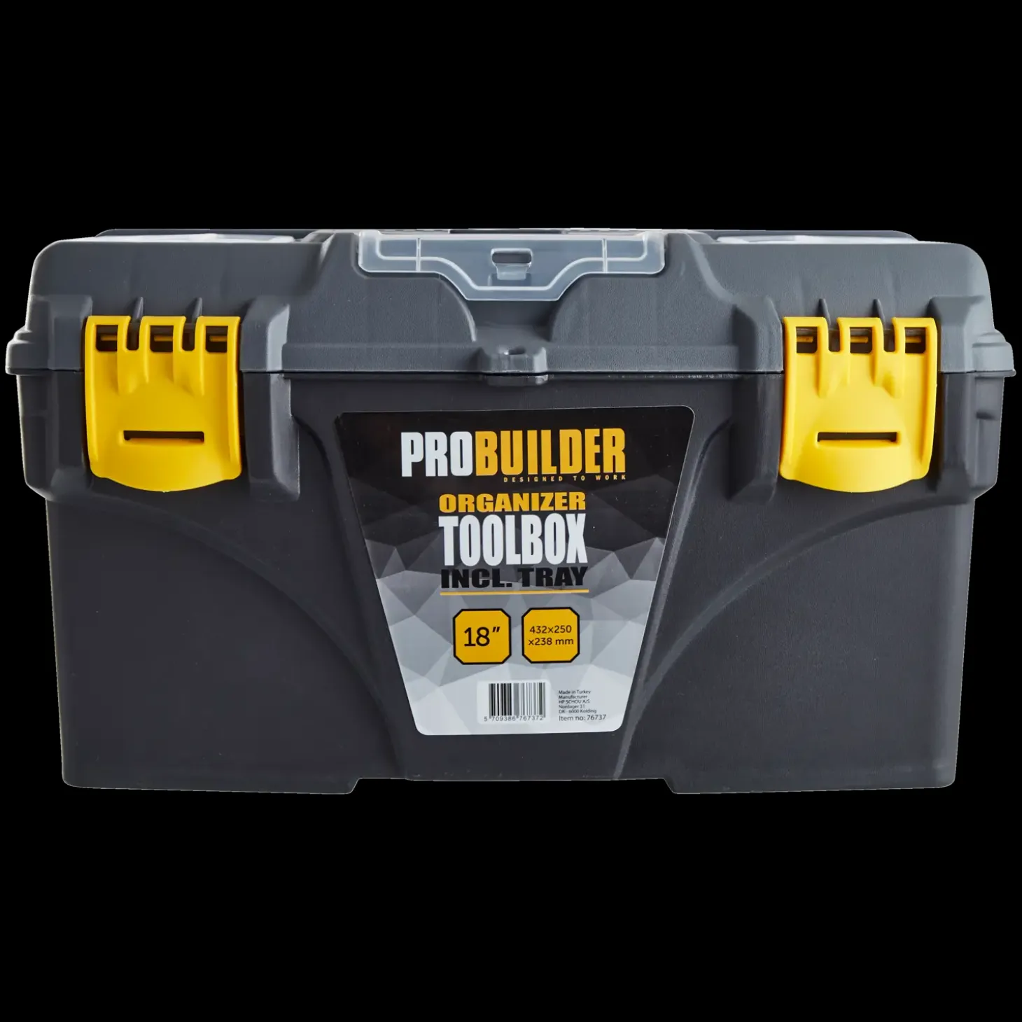 Probuilder 18″ værktøjskasse med løs indsatsbakke, lukkebeslag nedfældeligt håndtag samt sortimentsrum i låget.