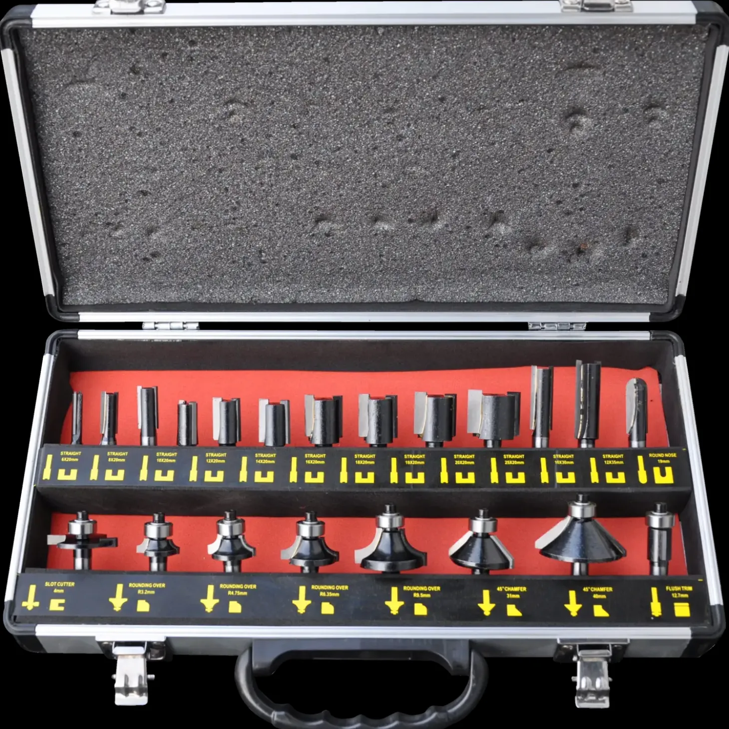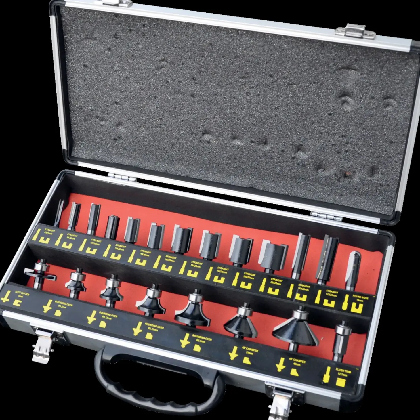 Overfræsesæt med 21 stk. overfræsebor med de mest gængse profiler med og uden kugleleje. Et meget alsidigt sæt som kan bruges til mange opgaver.