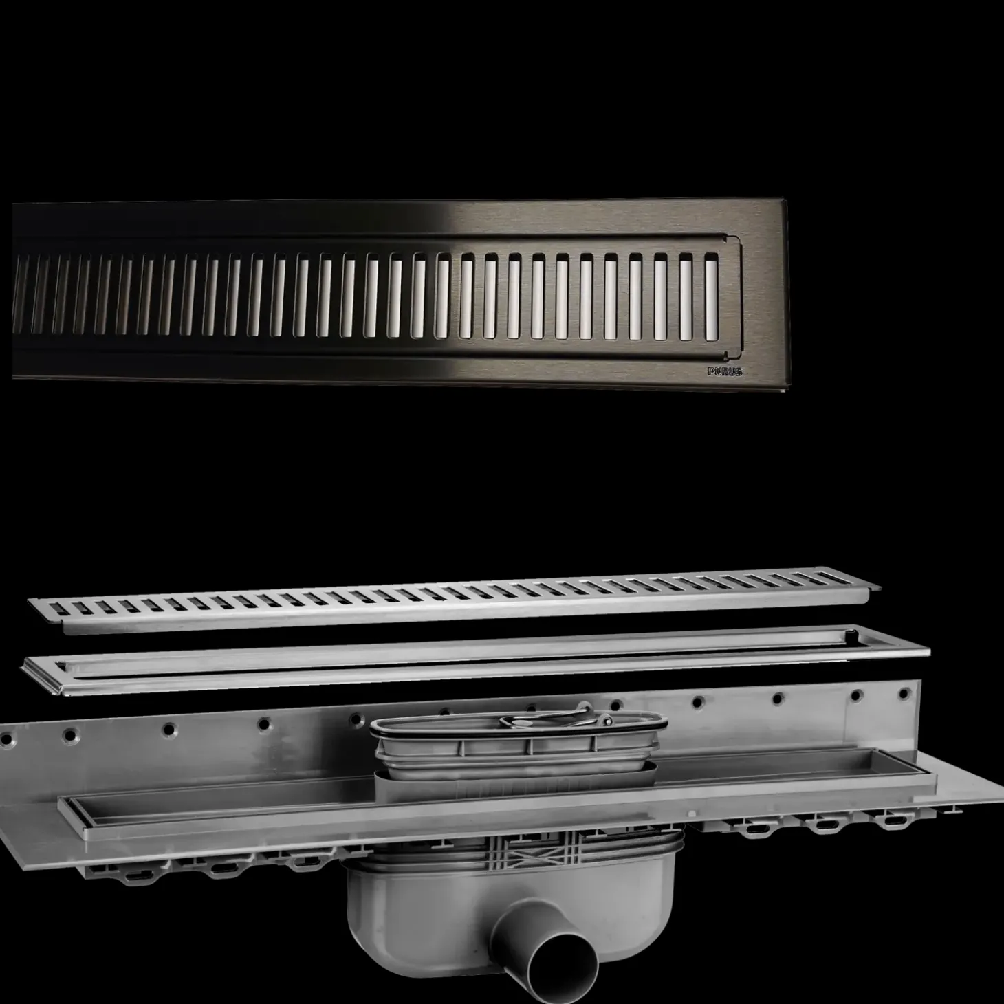 Purus afløbsrendesæt 1000 mm der indeholder 50 mm vandret vandlås og PURUS Line aflang afløbsrist og ramme RIB i rustfrit stål der er PVD coated behandlet for at opnå den specielle farve rist og ramme har.
