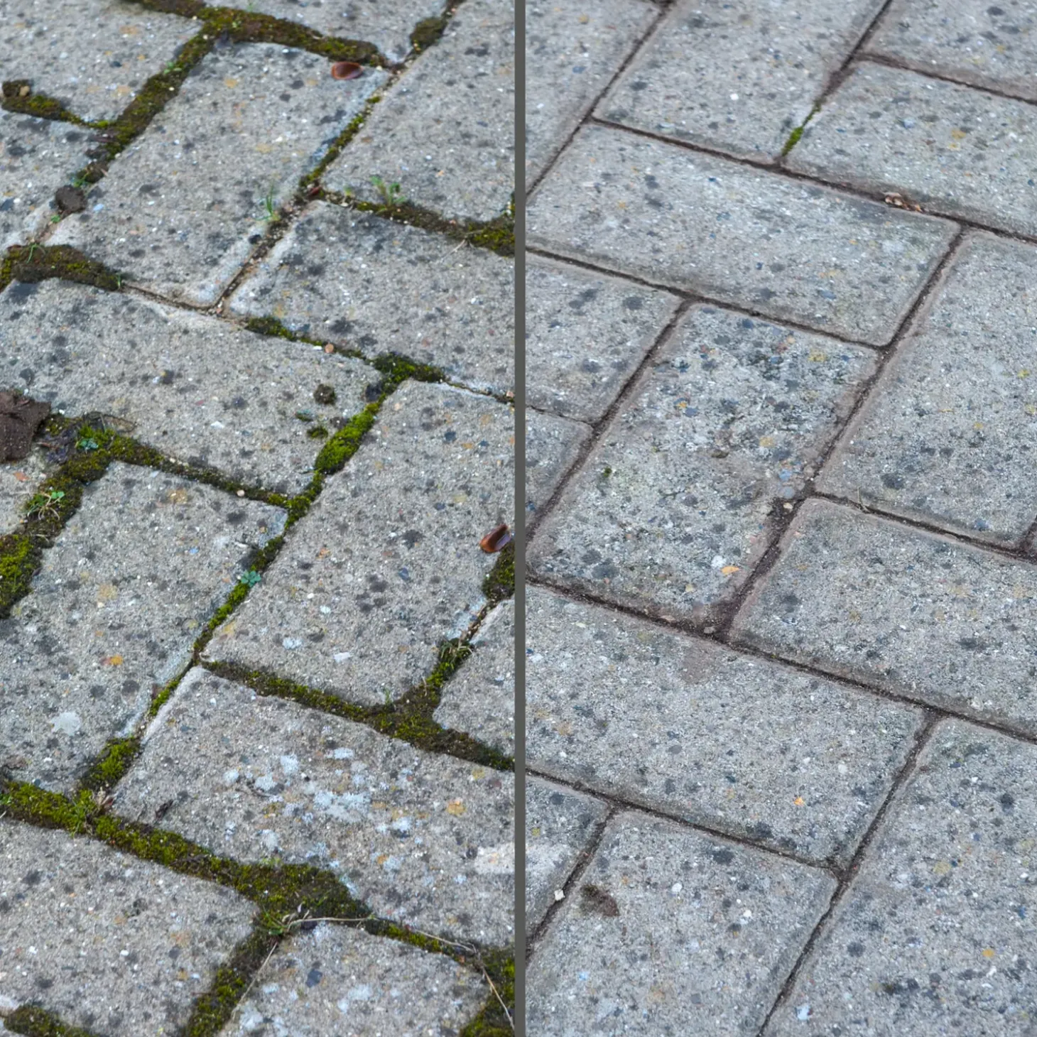 Nu er det slut med af ligge på knæ, denne fugerenser rengør nemt for mos, græs og andet snavs imellem havens mange typer belægninger med den roterende stålbørste.