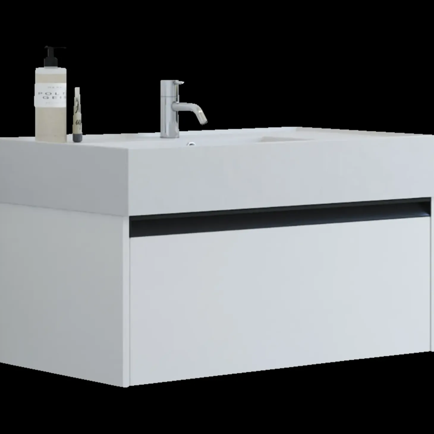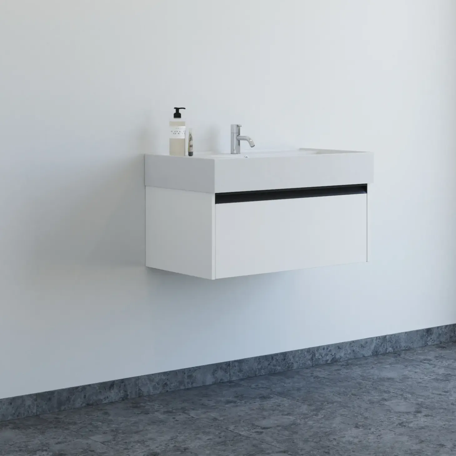 Opgrader dit badeværelse med denne stilrene møbelpakke i 80 cm bredde. Den markante Asyre håndvask i sanitetsporcelæn har et dybt, kantet bassin med flad bund, placeret i højre side for et asymmetrisk og moderne udtryk. Den hårde, blanke overflade er både elegant og nem at rengøre, mens det centrale afløb og armatur gør monteringen enkel og fleksibel. Det tilhørende vaskeskab har én rummelig skuffe med integreret greb, som giver en stilren finish og samtidig er nemt at gribe i uden at samle støv.