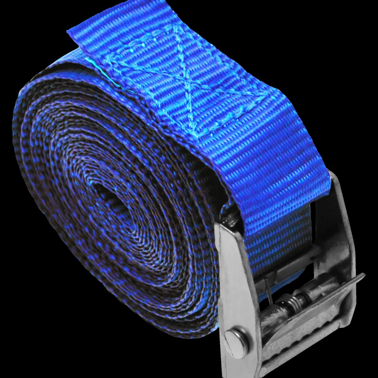 Detaljer:– 25 mm x 4 meter- Blå- Brudstyrke 500 kg- Metalspænde- Lastekapacitet 250 kg