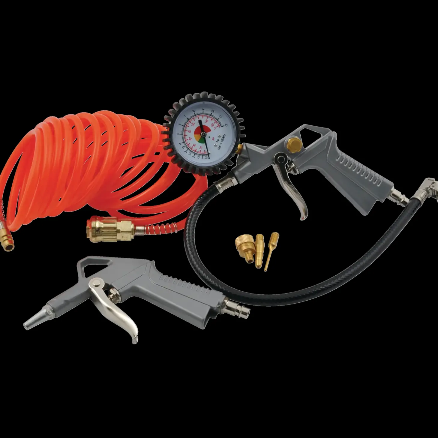 Sæt med blæsepistol, pumpepistol med manometer og 3 pumpenipler samt spiralslange 5 meter.