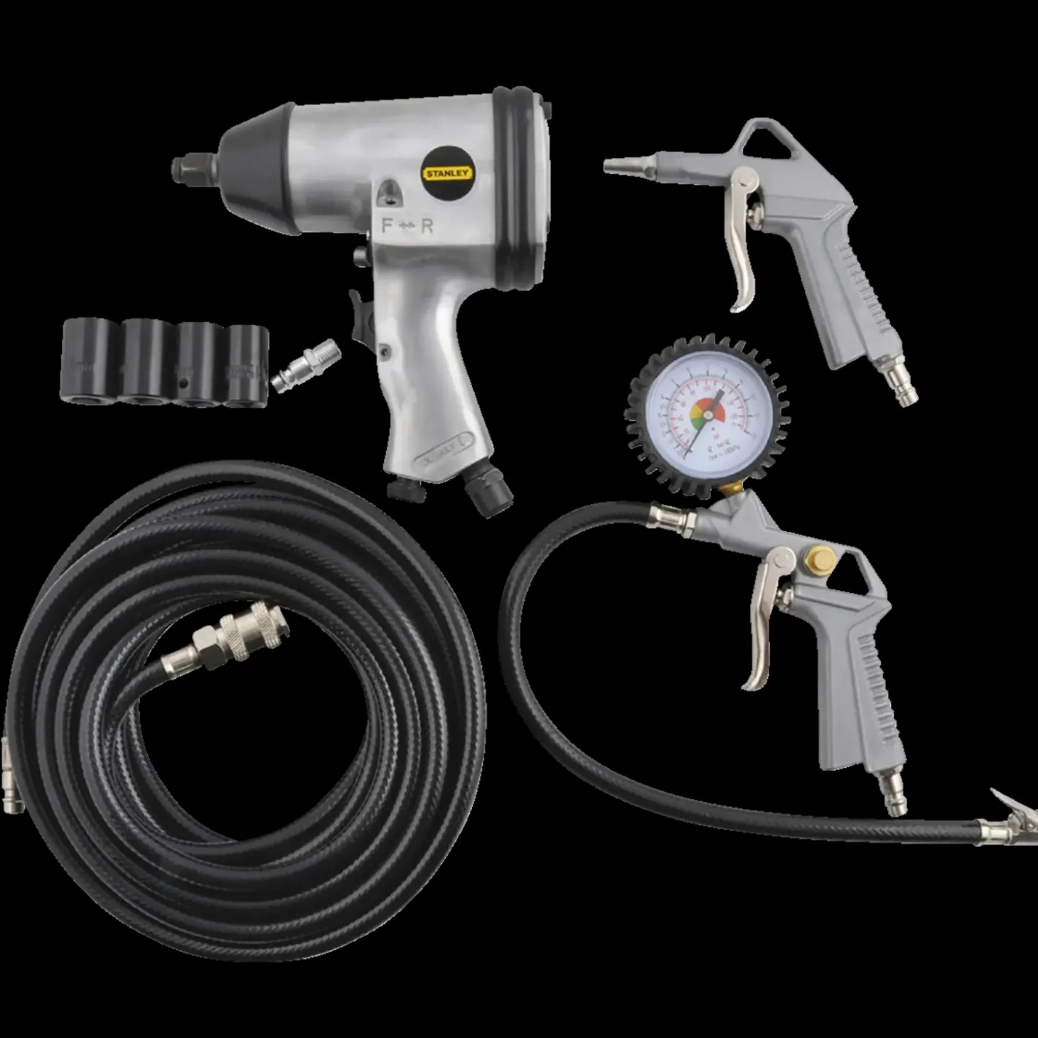 Komplet til hjulskifte med slagnøgle med 4 krafttoppe, blæsepistol og pumpepistol med manometer samt 5 meter spiralslange.