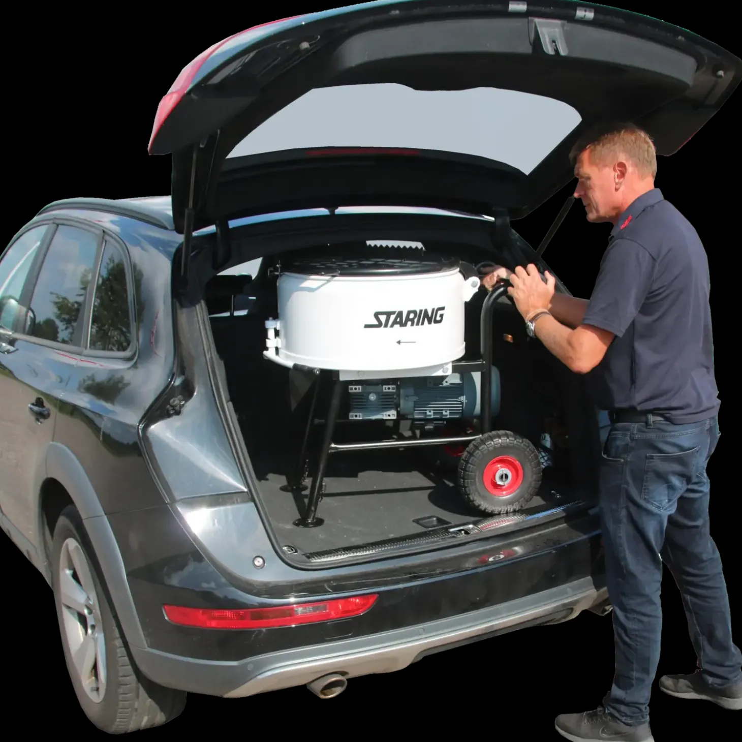 - Designet på STARING STB-65 gør blanderen nem at betjene for én mand. Ligeledes kan blanderen sænkes, så den kan transporteres bagi en stor “stationcar”