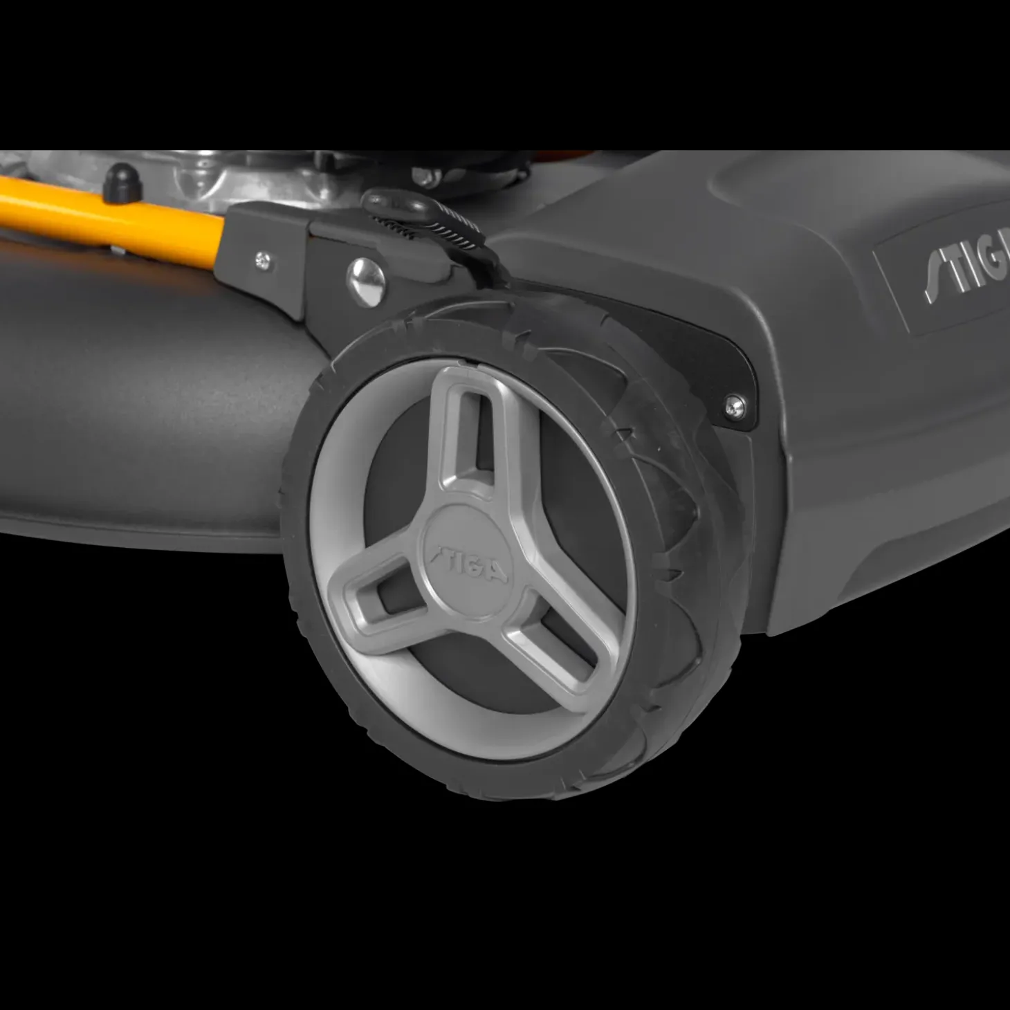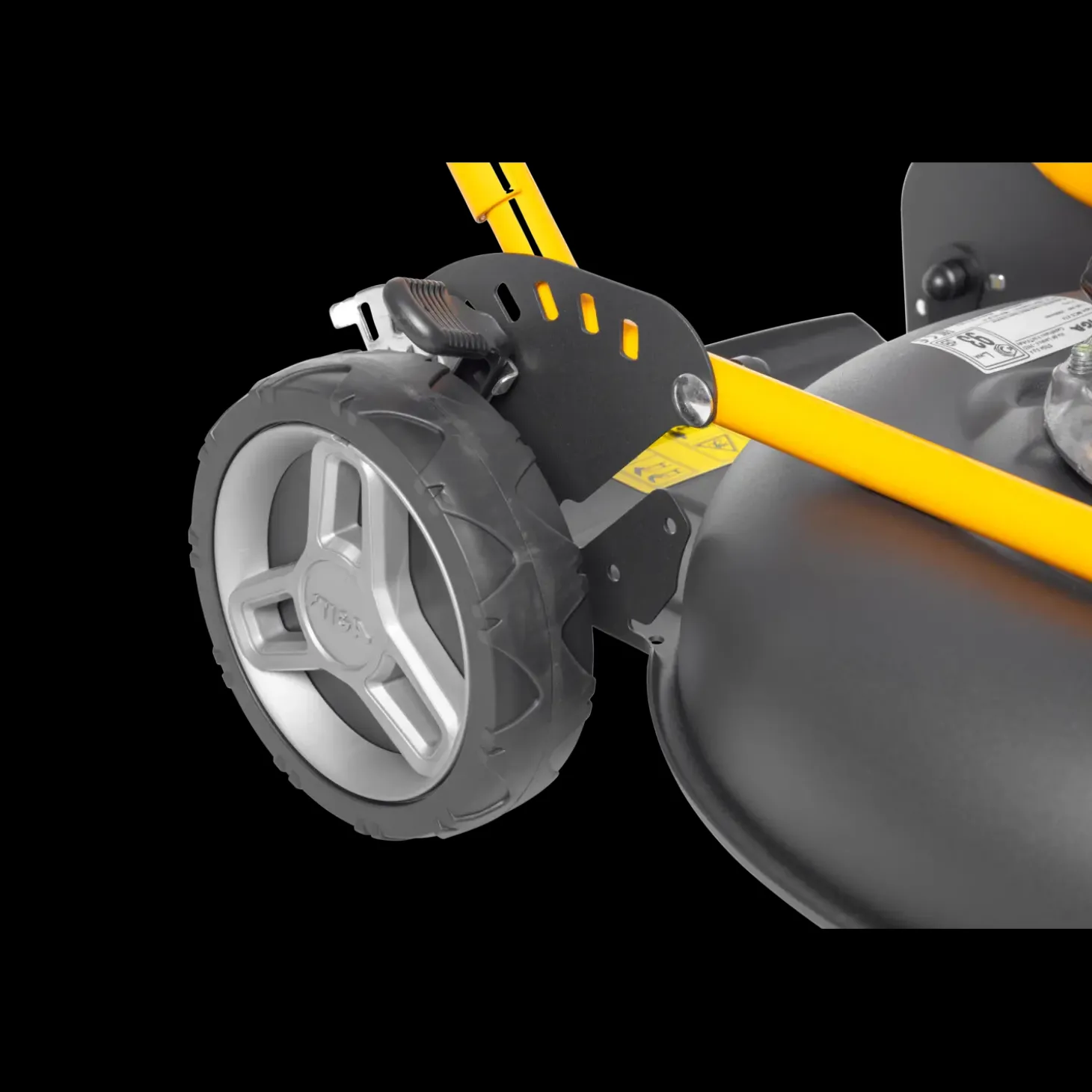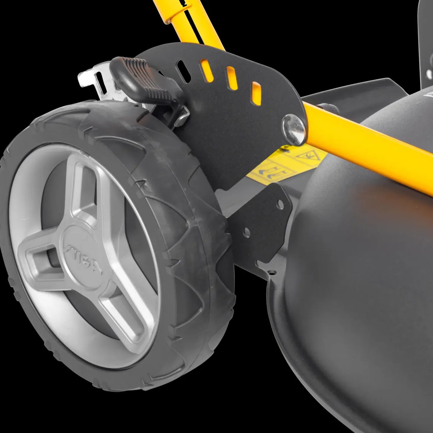 - Hjulene er monteret på kuglelejer, hvilket gør plæneklipperen mere robust og stabil