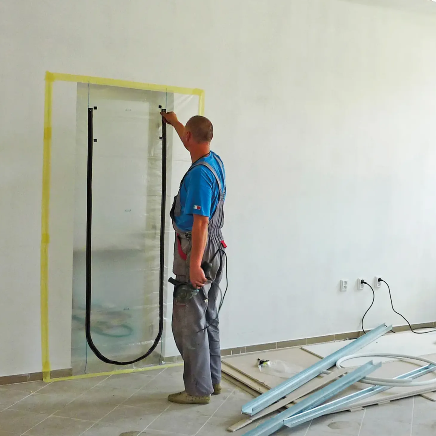 Med malertape. Kraftig lynlås gør at man fortsat kan bruge døren. Passer til døre fra 60-100 cm. Kan genbruges.