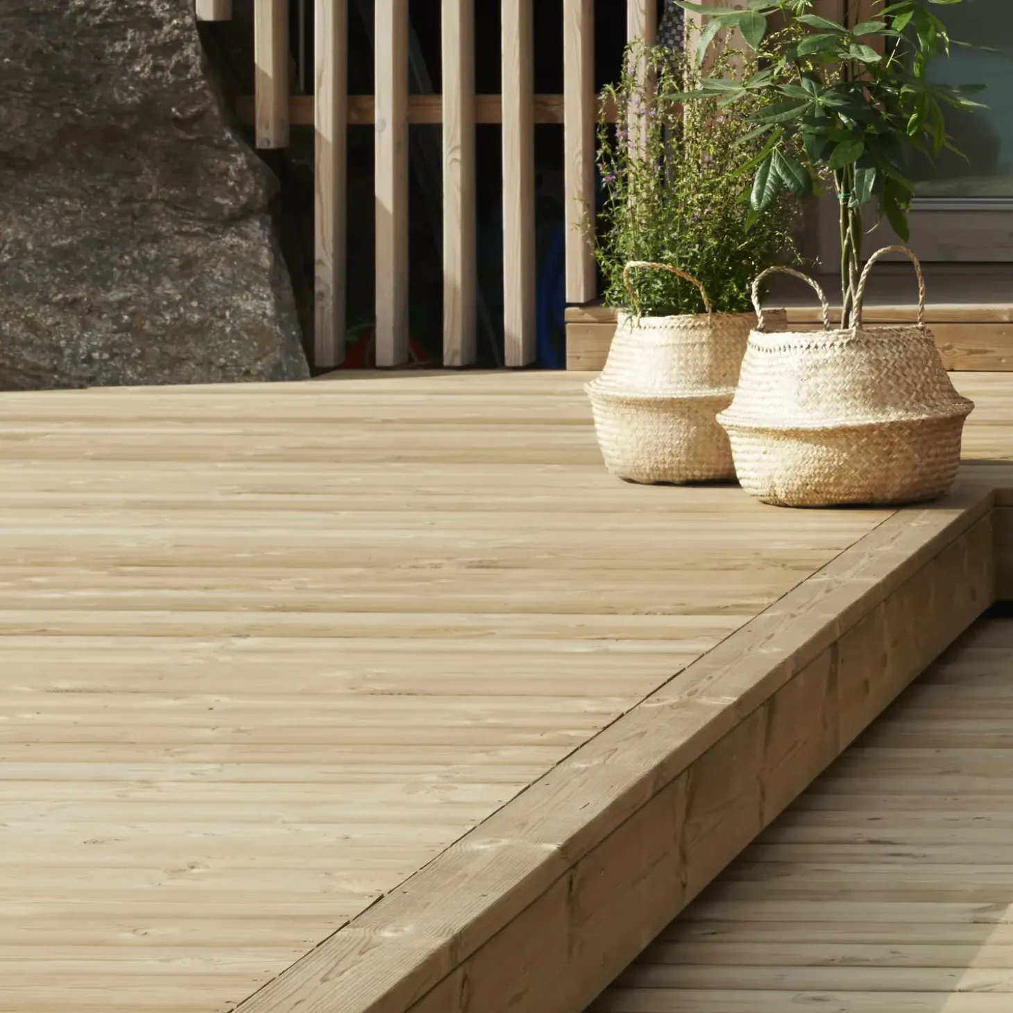 Svanemærket ThermoWood er den miljørigtige træbeklædning, som er varmebehandlet uden brug af kemikalier eller gasser. Nem forarbejdning og montage. Terrassebræt glat/glat. Ubehandlet ThermoWood patinerer til en smuk sølvgrå nuance og har en funktionstid på op til 15 år som terrasse.