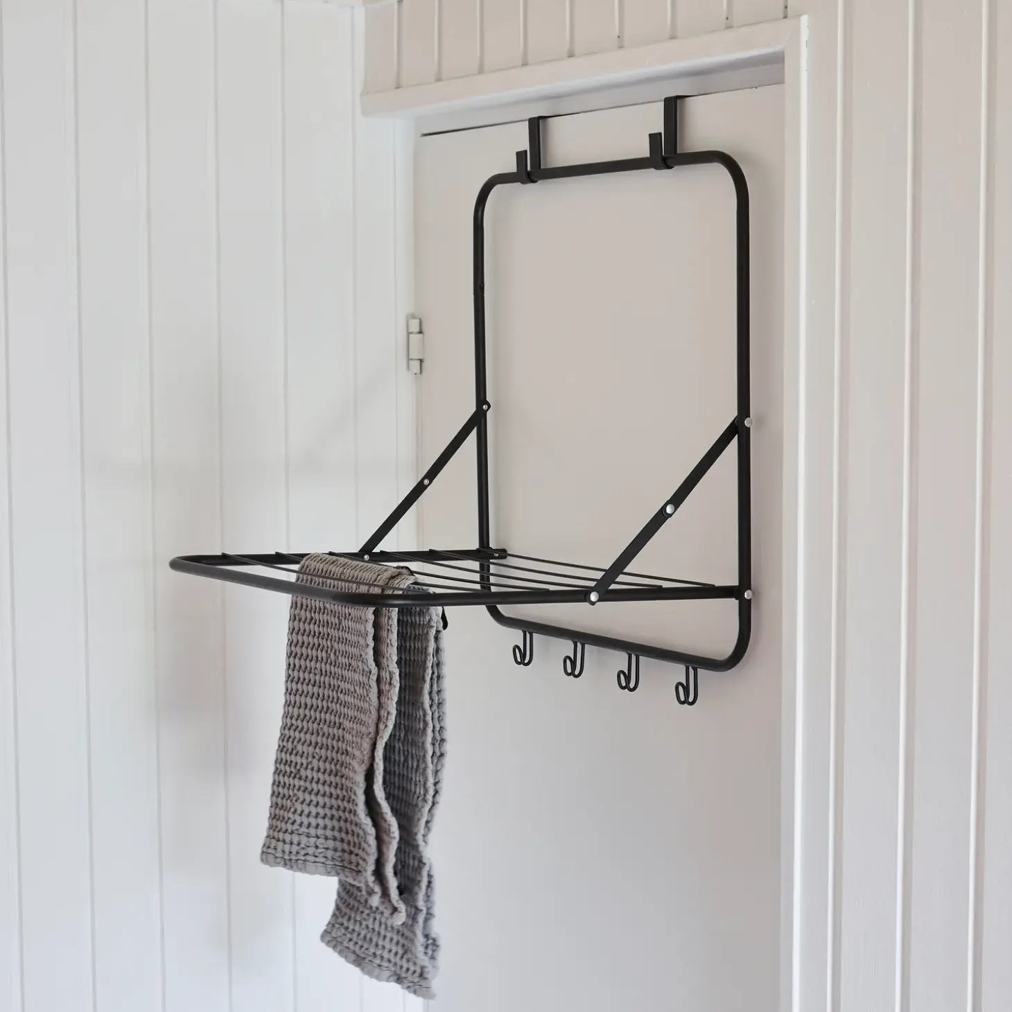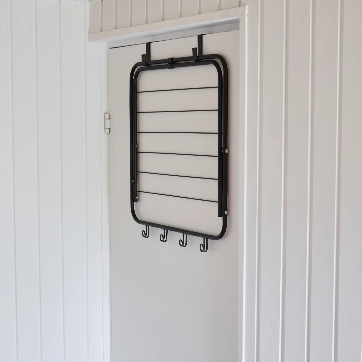 Smart lille tørrestativ til at hænge op på døre med to kroge, optager meget lidt plads og kan anvendes såvel hjemme, som i sommerhus, campingvogn m.m.