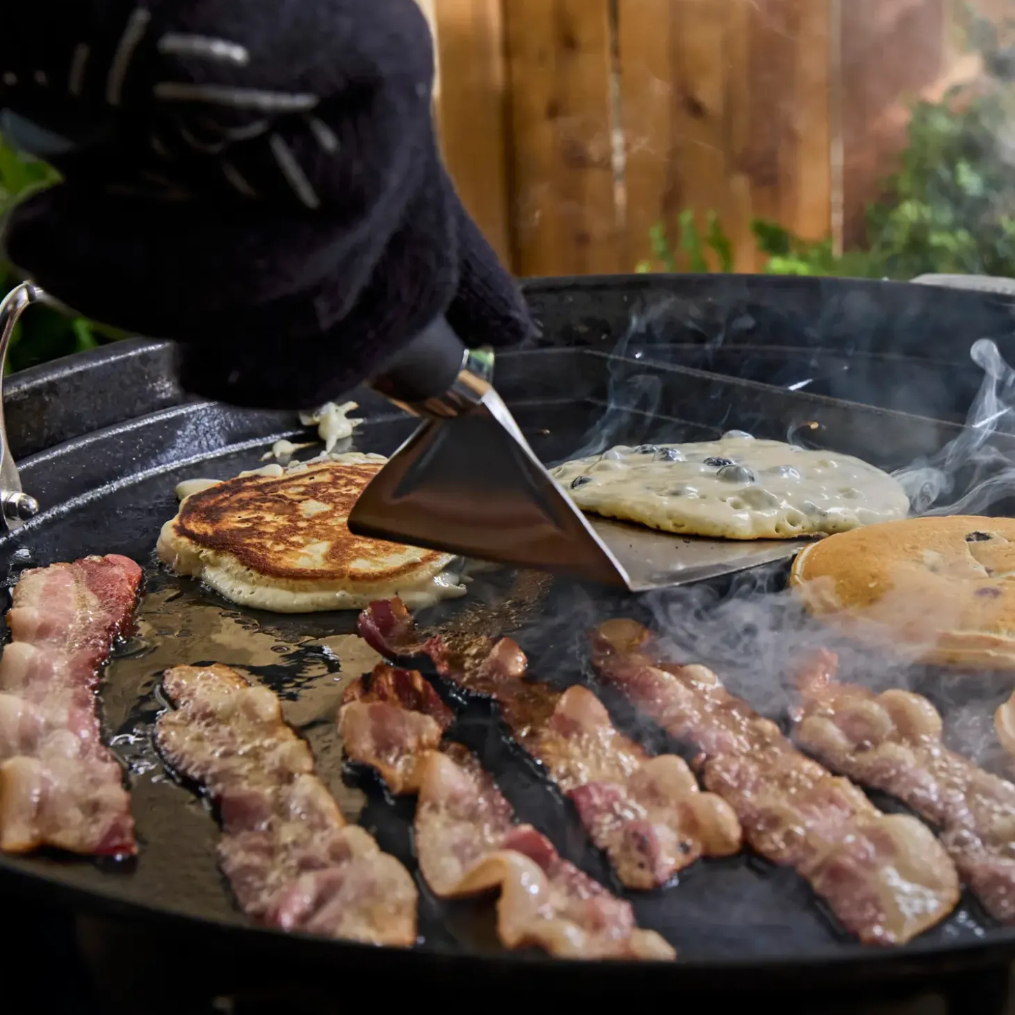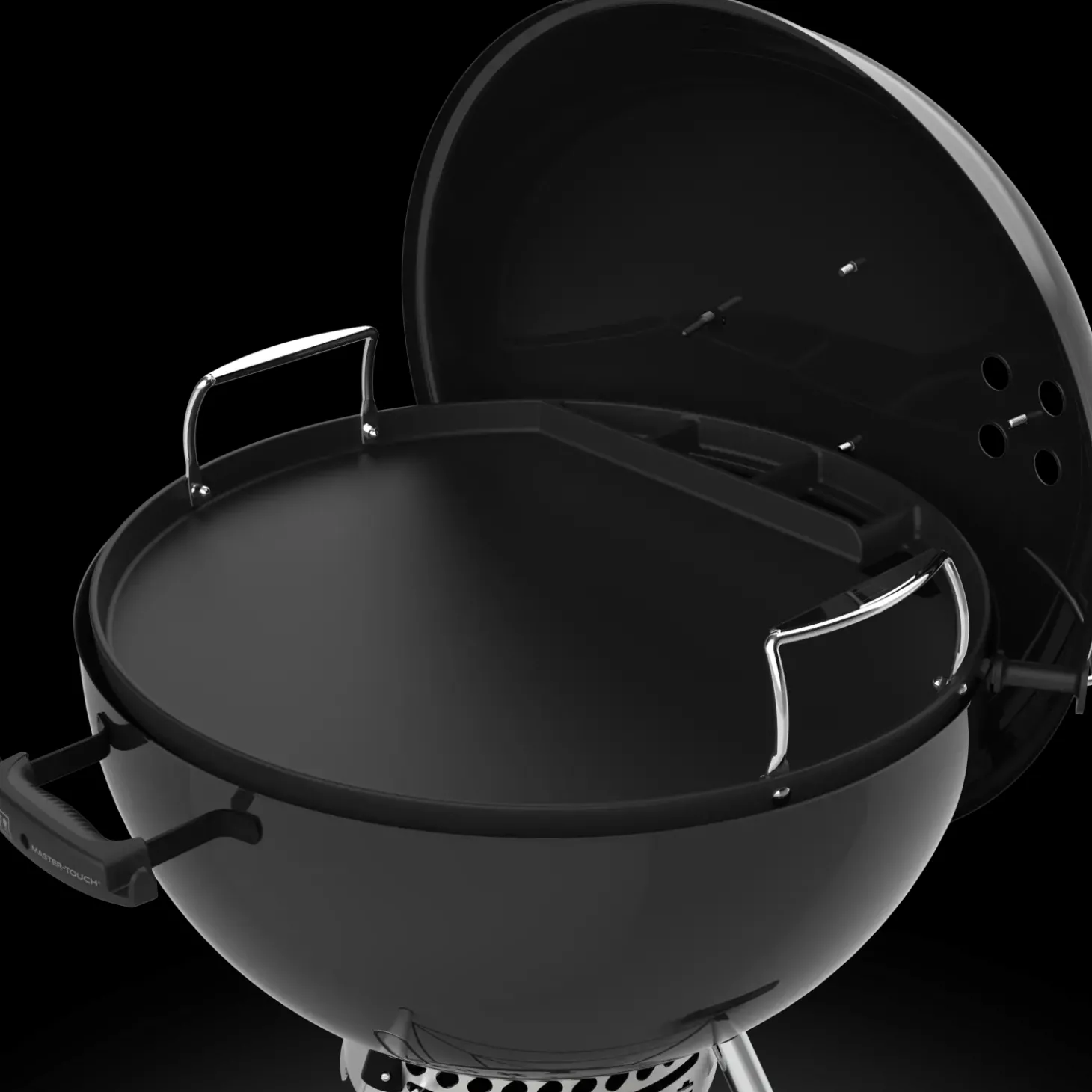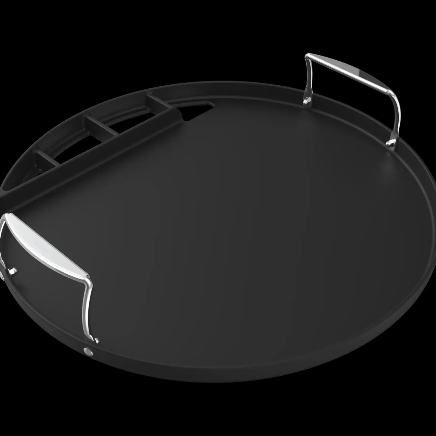 Forvandl din Weber-kuglegrill på 57 cm til en hel stegeplade med stegepladeindsatsen i porcelænsemaljeret støbejern, og nyd sprødstegt bacon, lynstegte skaldyr, smashedburgers, grøntsager og meget mere. Den runde plade med de hævede kanter, dækker hele grillfladen og de to stabile håndtag i rustfrit stål, gør det nemt at sætte pladen i grillen og løfte den op igen. Pladen rengøres nemt og hurtigt takket være åbningen til fjernelse af fedt bagerst på pladen.