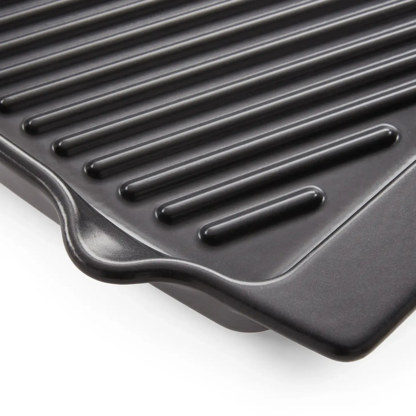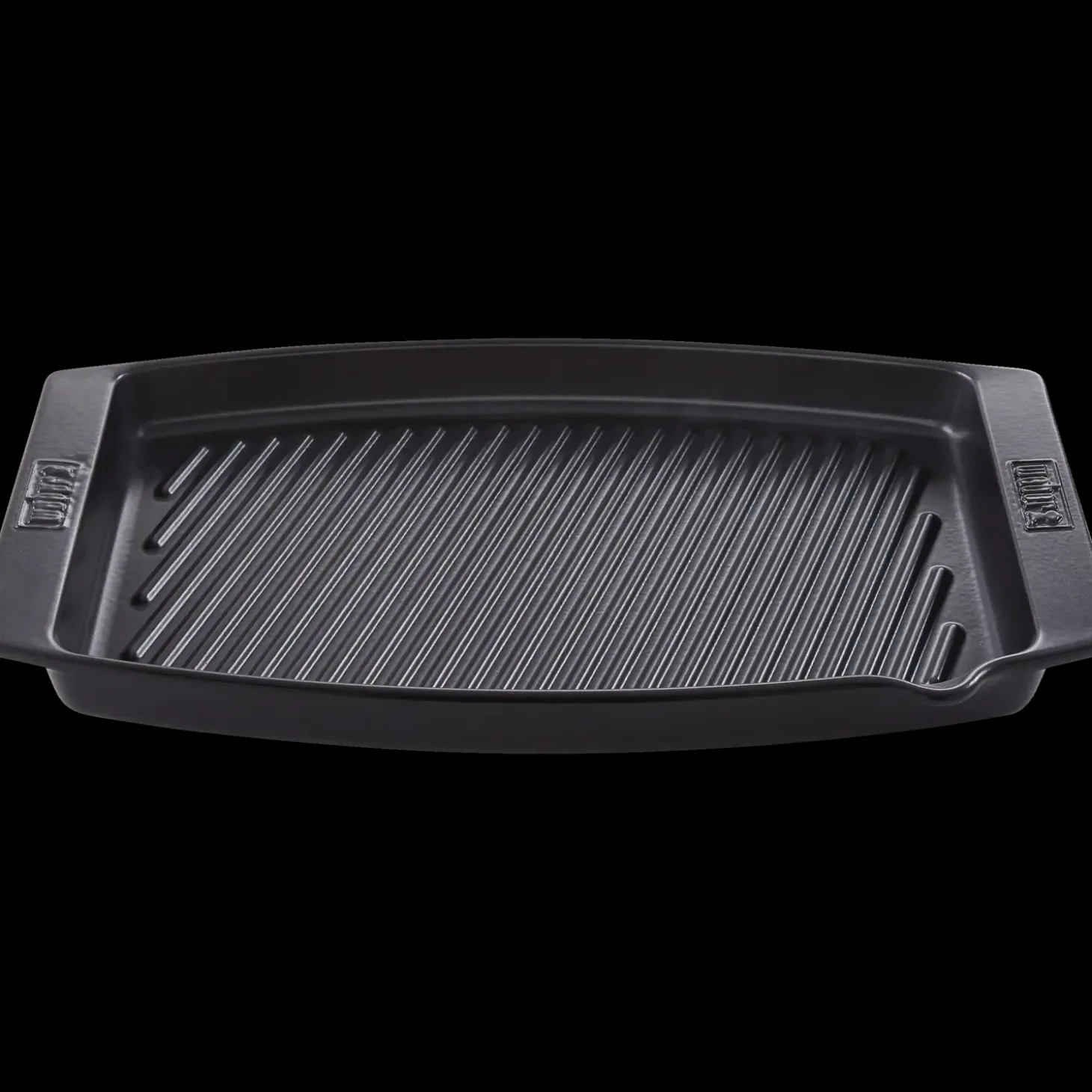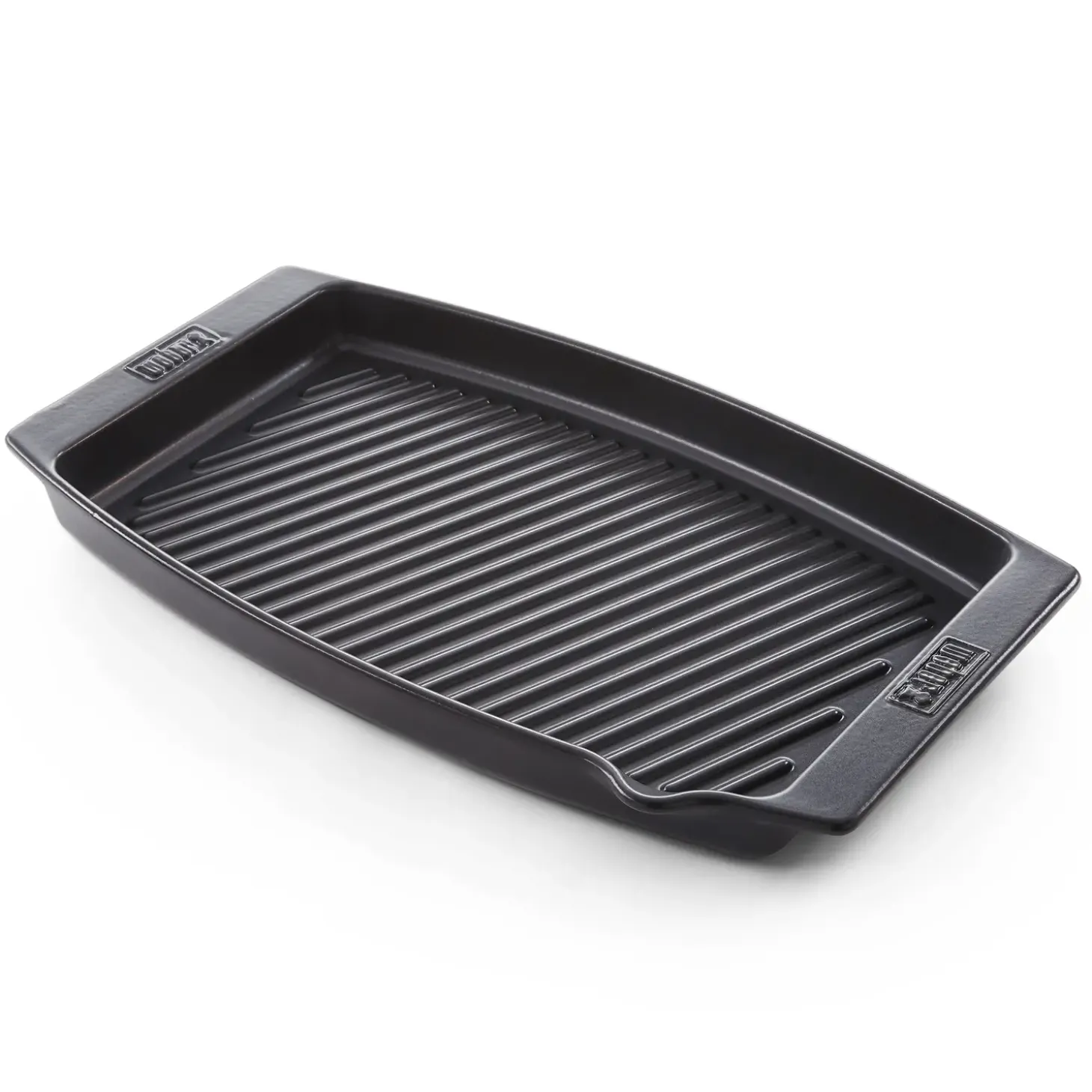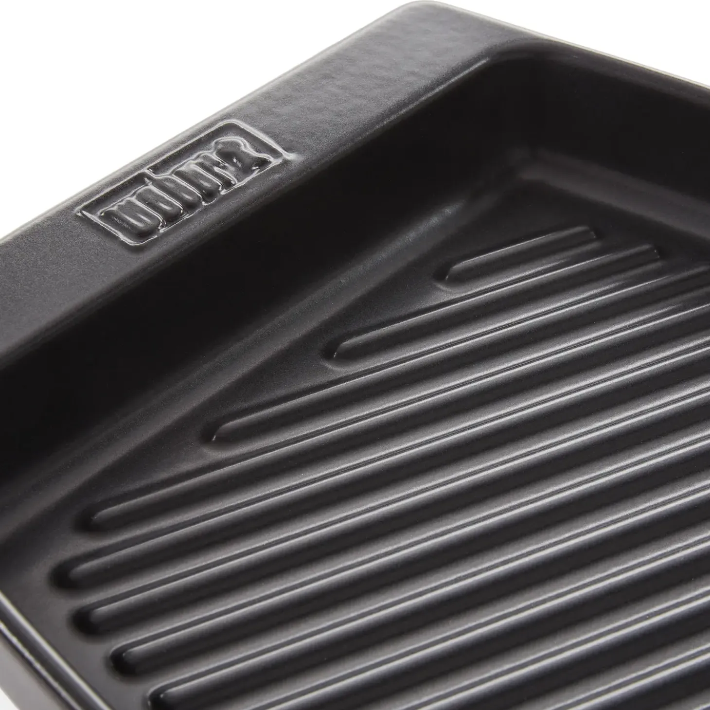 Weber grillpande er fremstillet i keramisk materiale, hvilket gør panden ridsefast og robust overfor maskinopvask. Pandens høje design gør det nemt at holde saften i pladen således at du er sikret en god sauce. Du kan anvende grillpanden til både gas, kul samt elgrill, og kan roligt smide den i opvaskemaskinen efter brug.