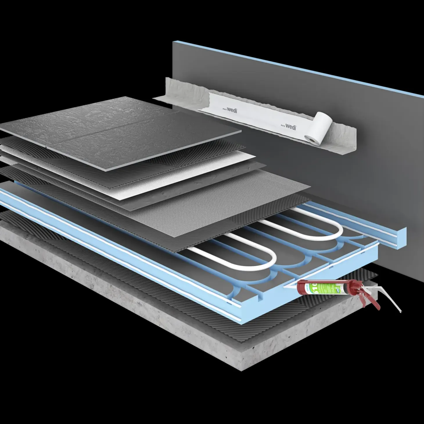 Vandtæt tætningsmasse/montagelim til montering af wedi gulvelementer på træ, glas, metaller, PVV, musten og fliser.