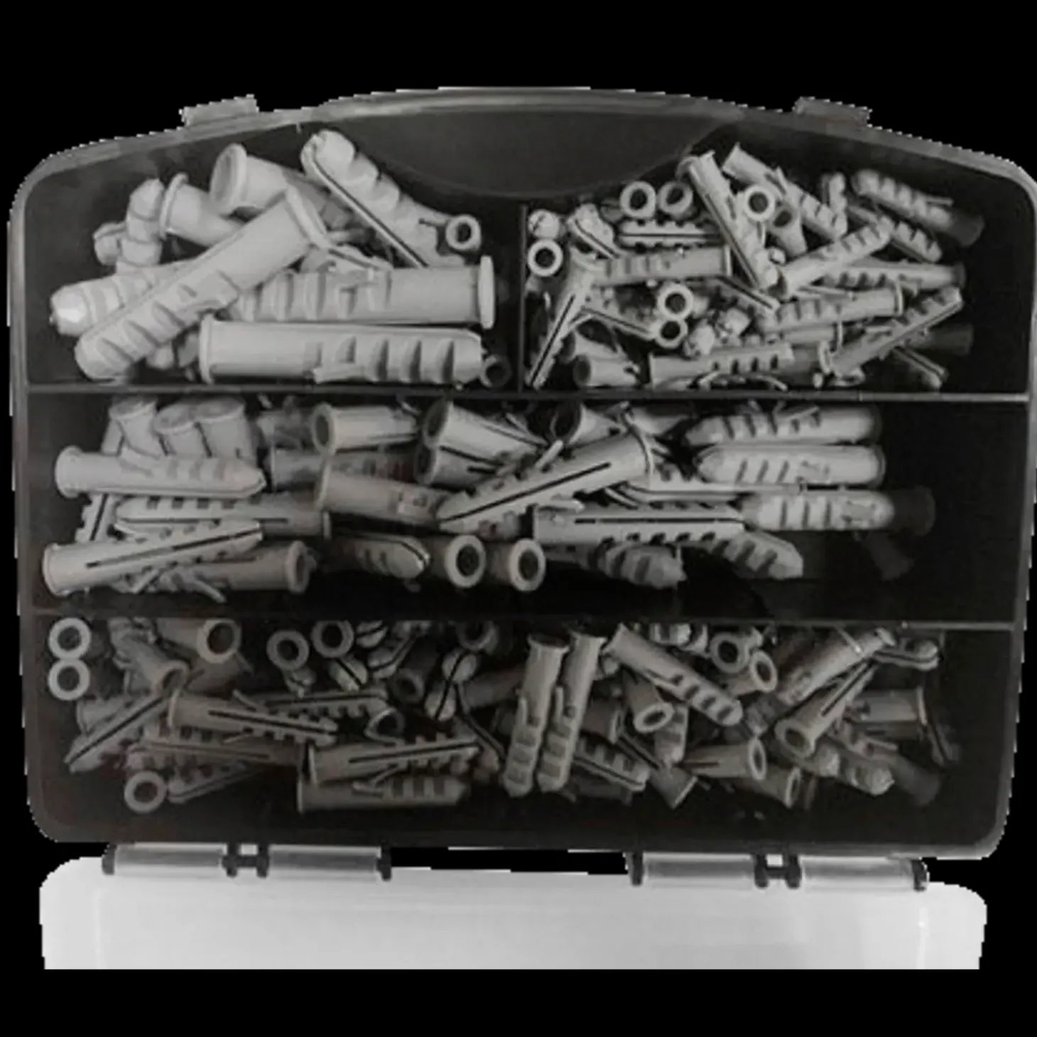 Praktisk sortimentsboks med 4 forskellige størrelser rawlplugs med krave. Rawlplugsene er både til beton og mursten