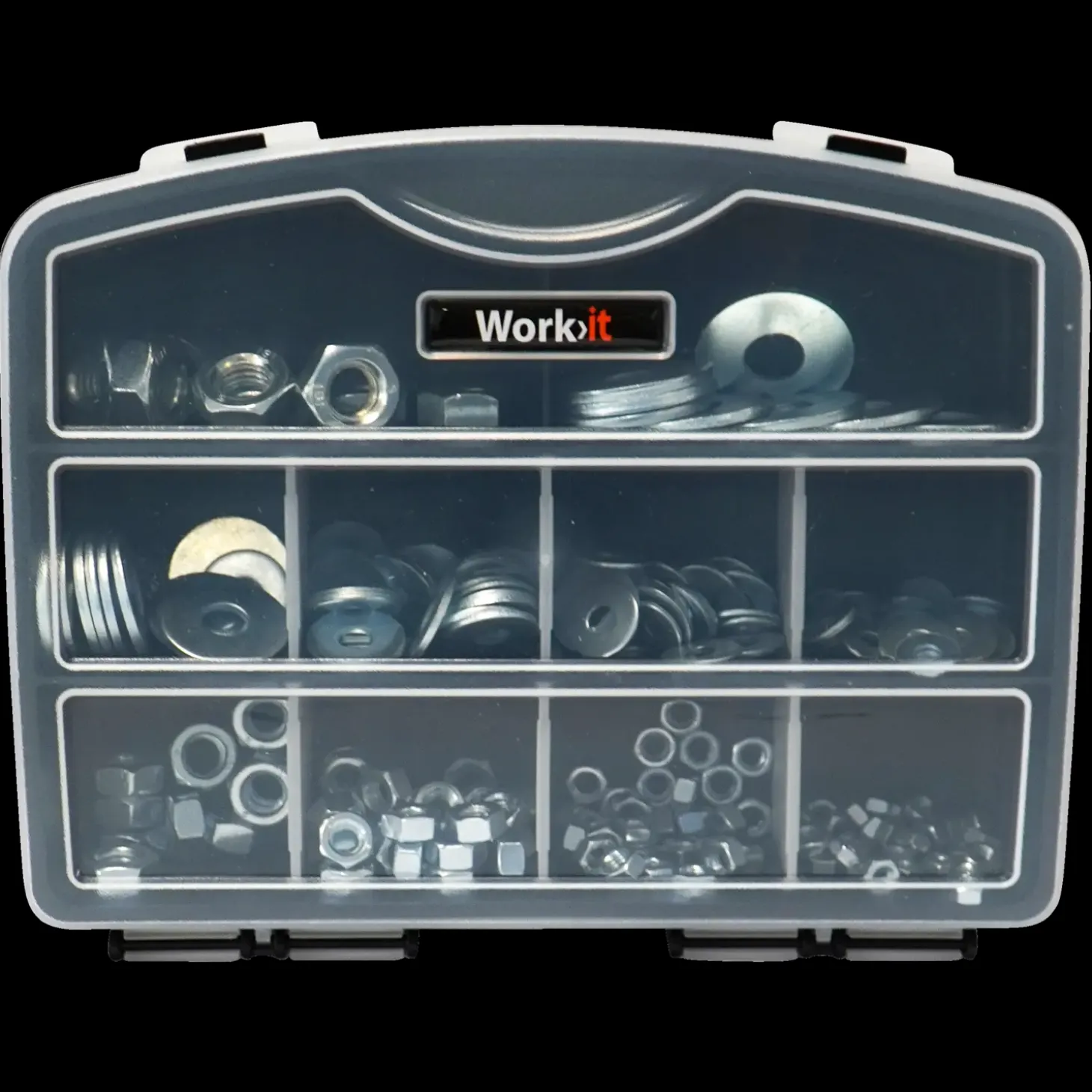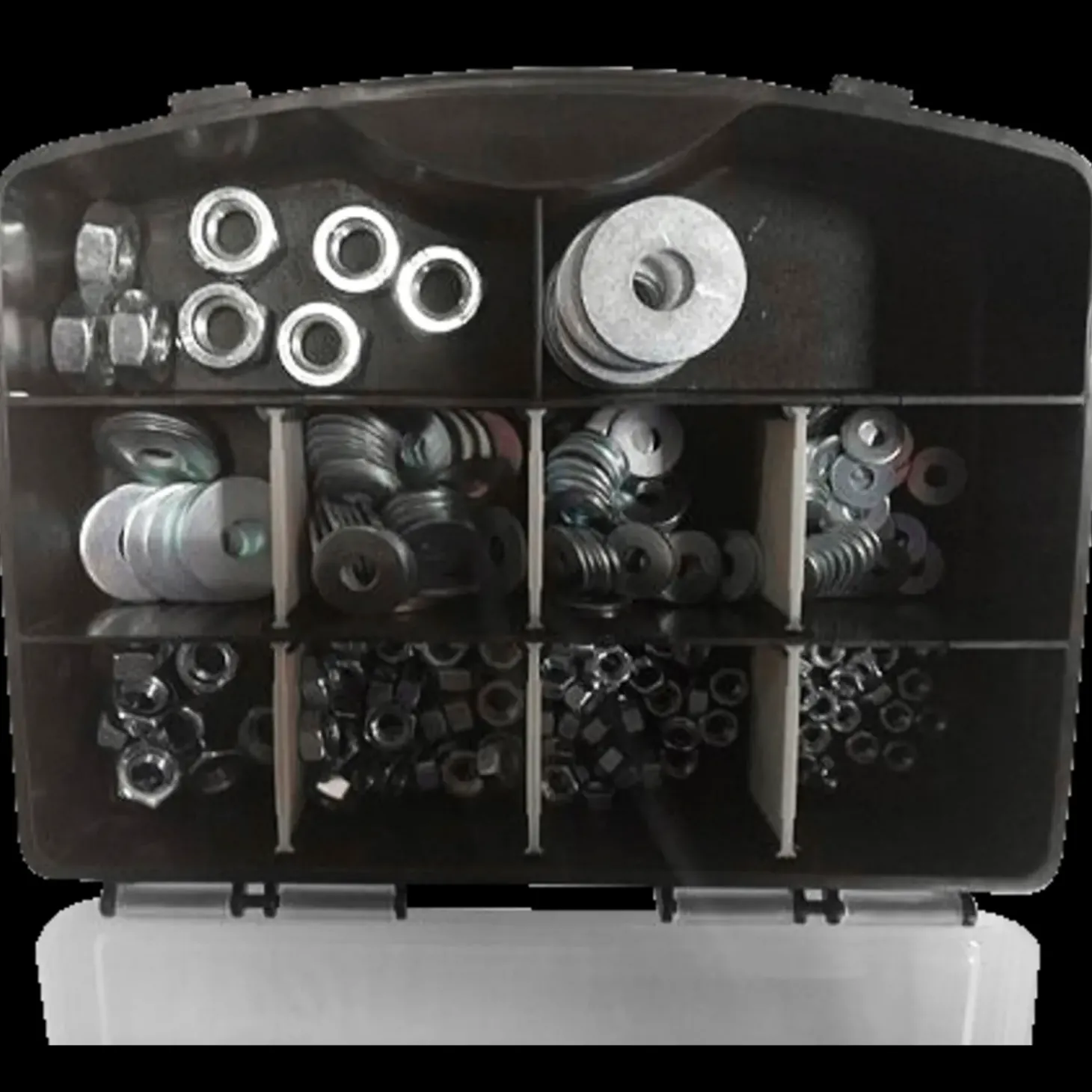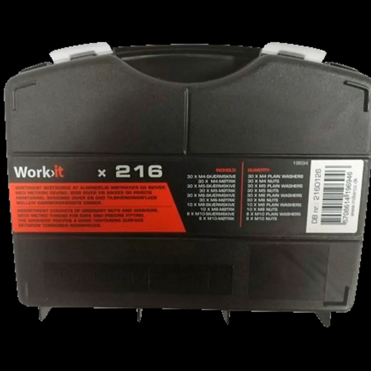 Med denne sortimentskasse har du de mest almindelige skiver og møtrikker ved hånden. Møtrikkerne er med metrisk gevind, som sikre en mere præcis montering og skiverne giver en passende tilspændingsflade.
