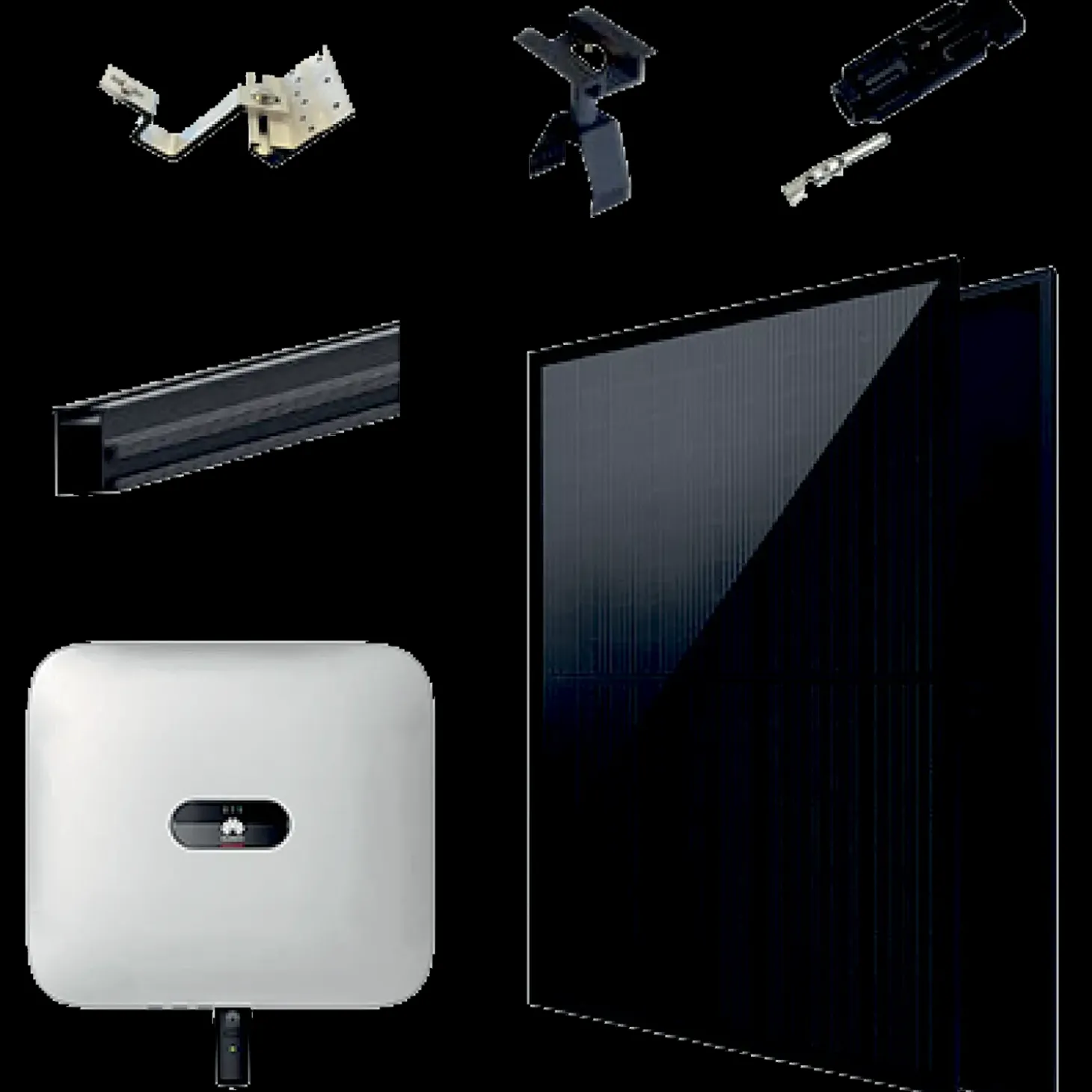 Solcellepakke til tegl- og betontag 8 stk. Hyundai solcellepaneler 430Wp 3,44 kWp, 3 kW Huawei hybrid inverter.