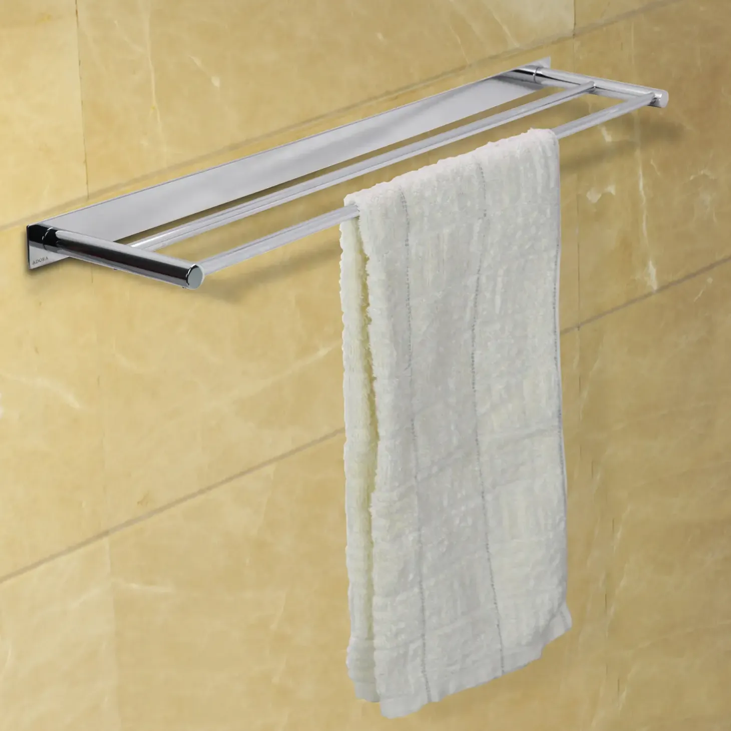 Håndklædestang dobbelt, krom. Kan monteres både med og uden bagpladen. Bagpladen er velegnet til at skjule tidligere huller.