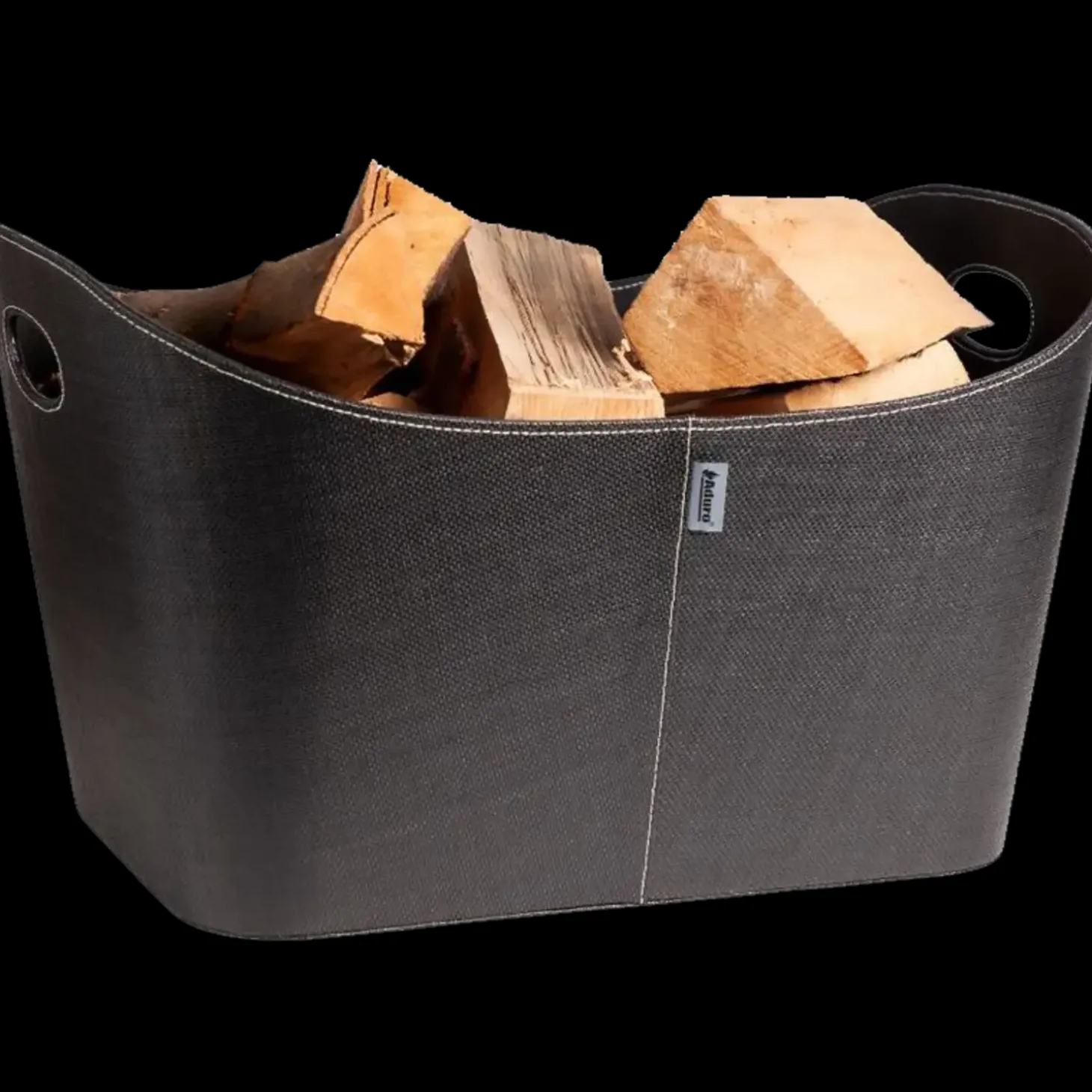 Stilfuld og rummelig brændekurv i sort polyester med tydelige syninger. Foruden brænde er kurven velegnet til opbevaring af aviser, magasiner og børnenes legetøj. Kurven har håndtag, så den er let at flytte med.