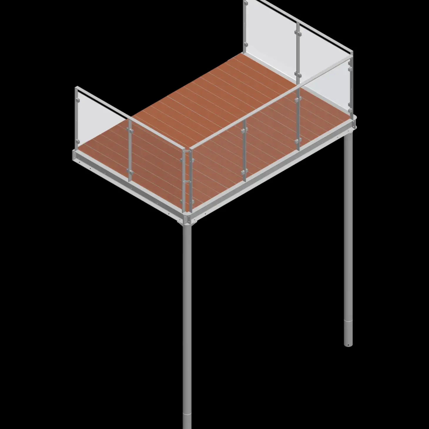 Materialer: Varmforzinket stål og terrassebrædder i hårdttræ. Værnet er i hærdet, lamineret glas.