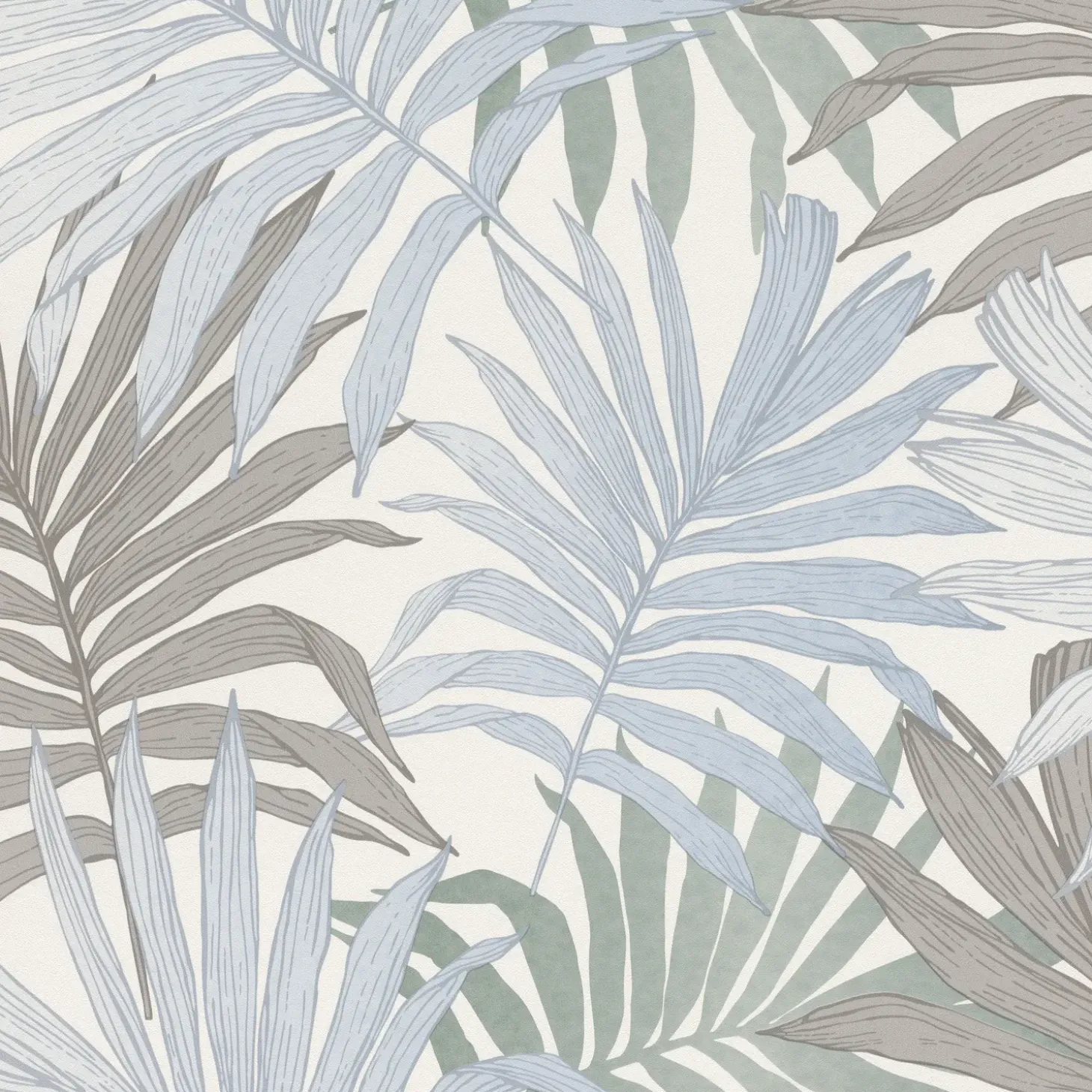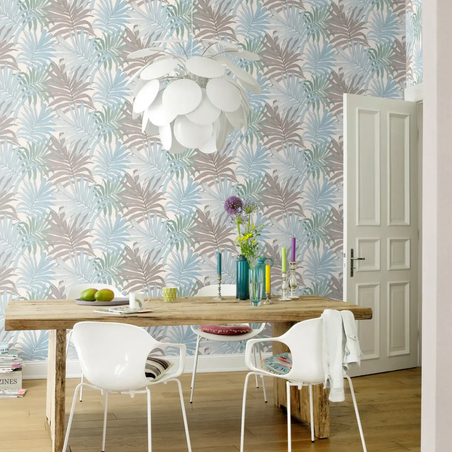Tapet med store grene og blade der er placeret i et tæt, jævnt og harmonisk mønster.