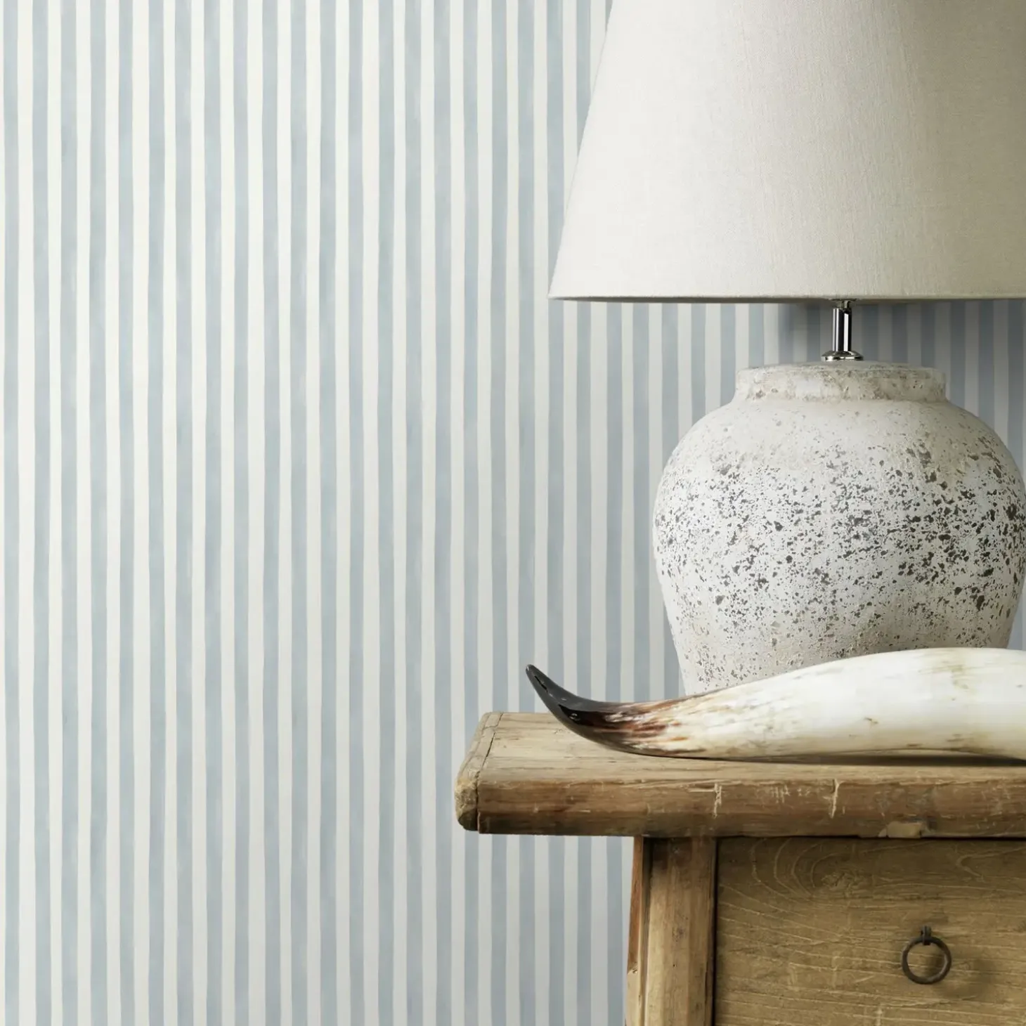 Et stribet tapet med brede striber, der giver enkle, nordiske og behagelige nuancer, der kan passe til både en traditionel og moderne indretning. Perfekt til både børneværelset, gangen, stuen og soveværelset. Skab en badehotelsstemning med tapetet.
