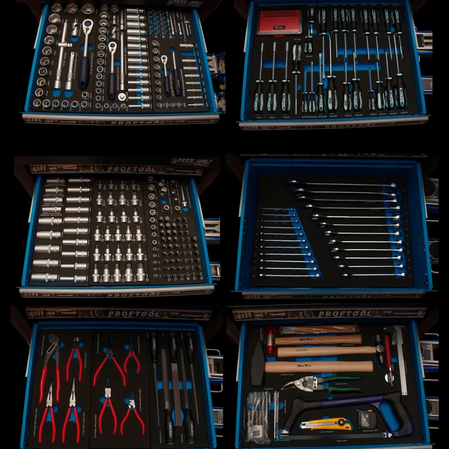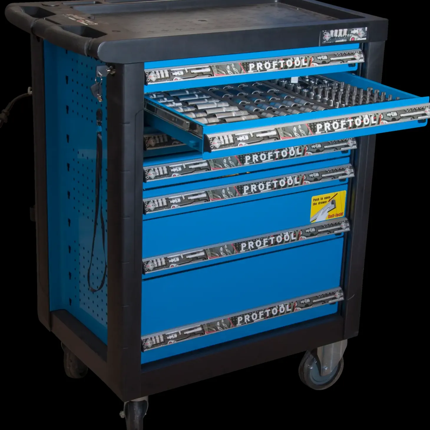 Værktøjsvogn fra Bato med 7 skuffer, hvoraf de 6 er med værktøj, i alt 435 dele i forstøbt EVA skum for sikker opbevaring.