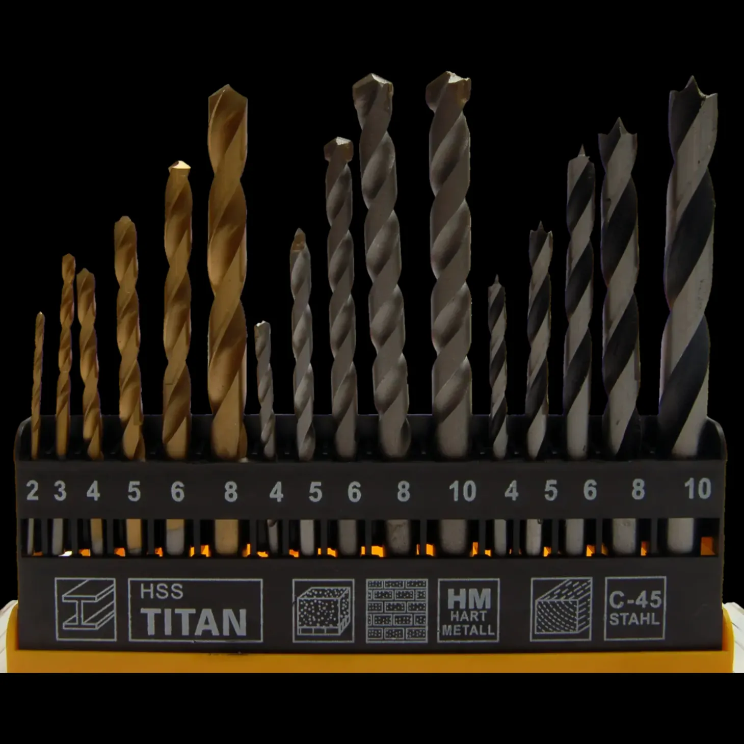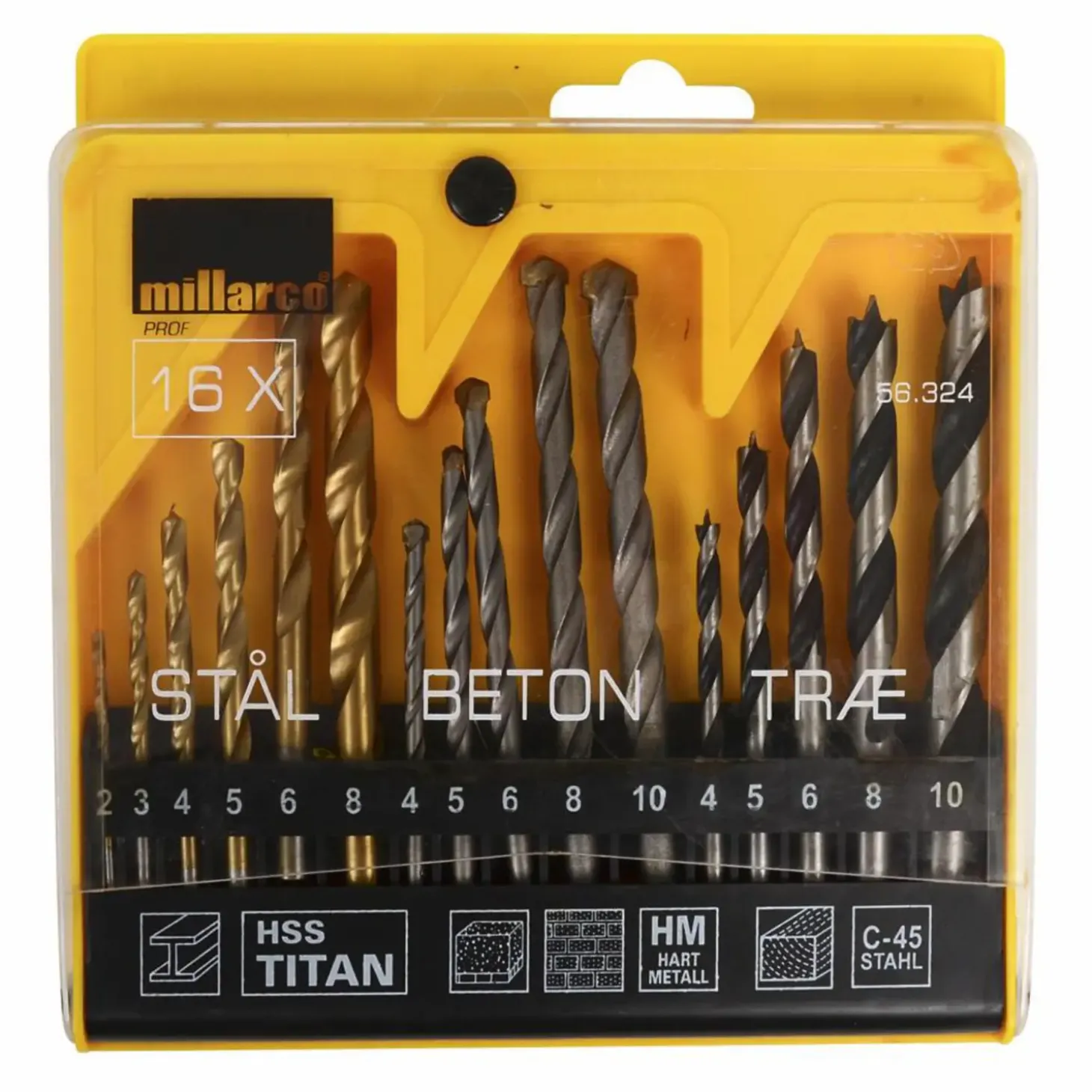 Borsæt kombi 16 dele til træ, mur og metal. Den leveres i praktisk kassette.