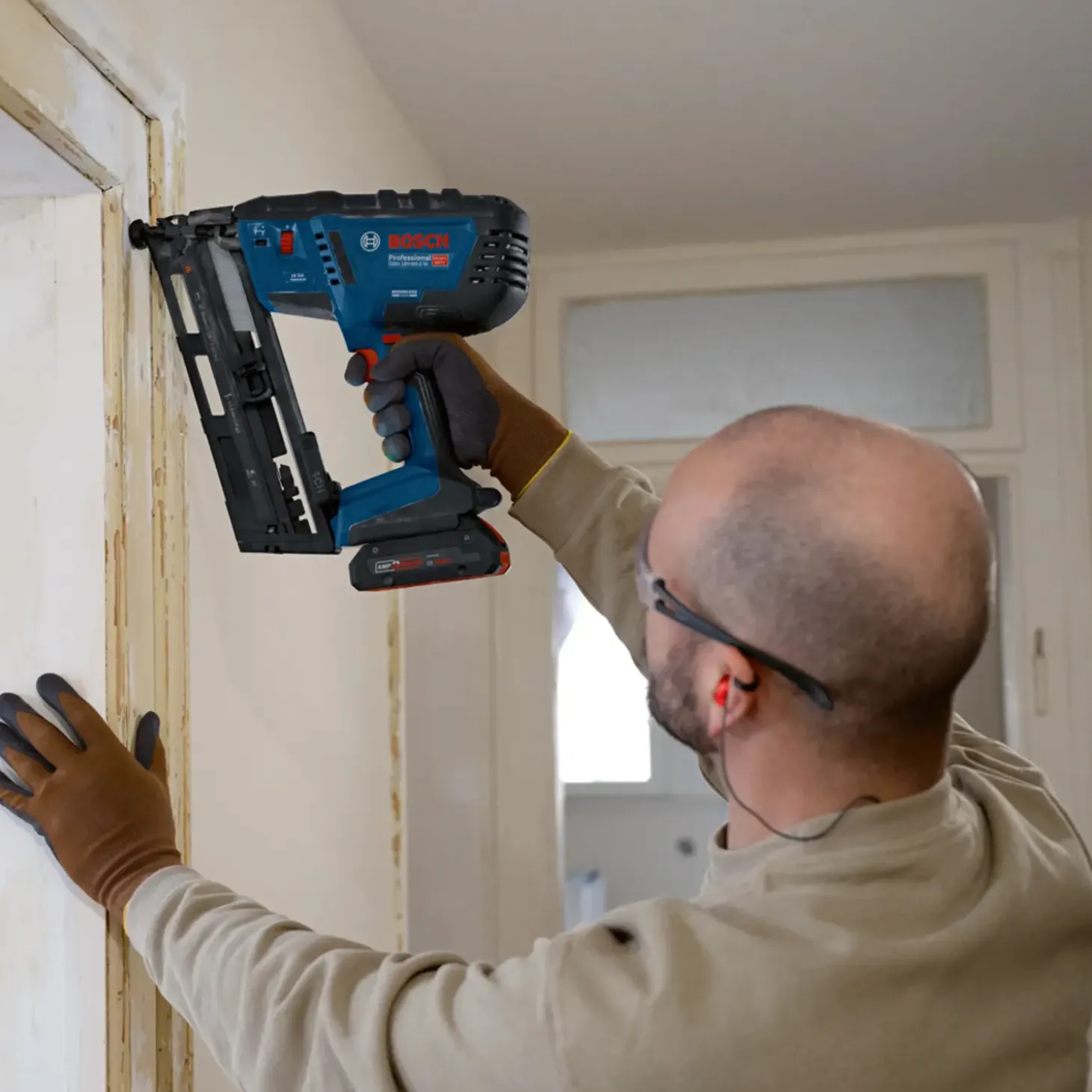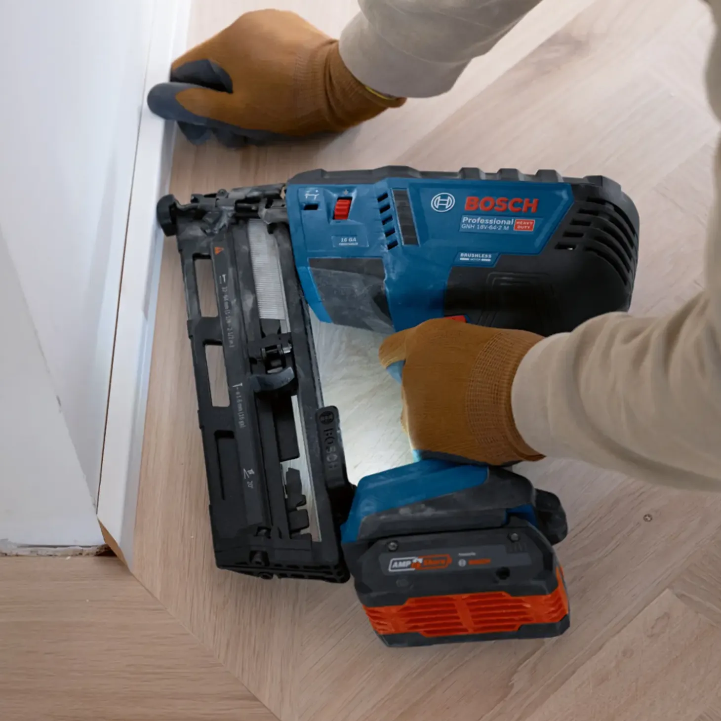 Ideel til fastgørelse af vindues- og dørindfatninger, loftslister, montering balustre på trappegelændere, lofts- og gulvpaneler med fer og not (skjult samling) samt fodpaneler og fodlister. Kompatibel med Bosch Professional 18V System og batterier i AMPShare-alliancen.