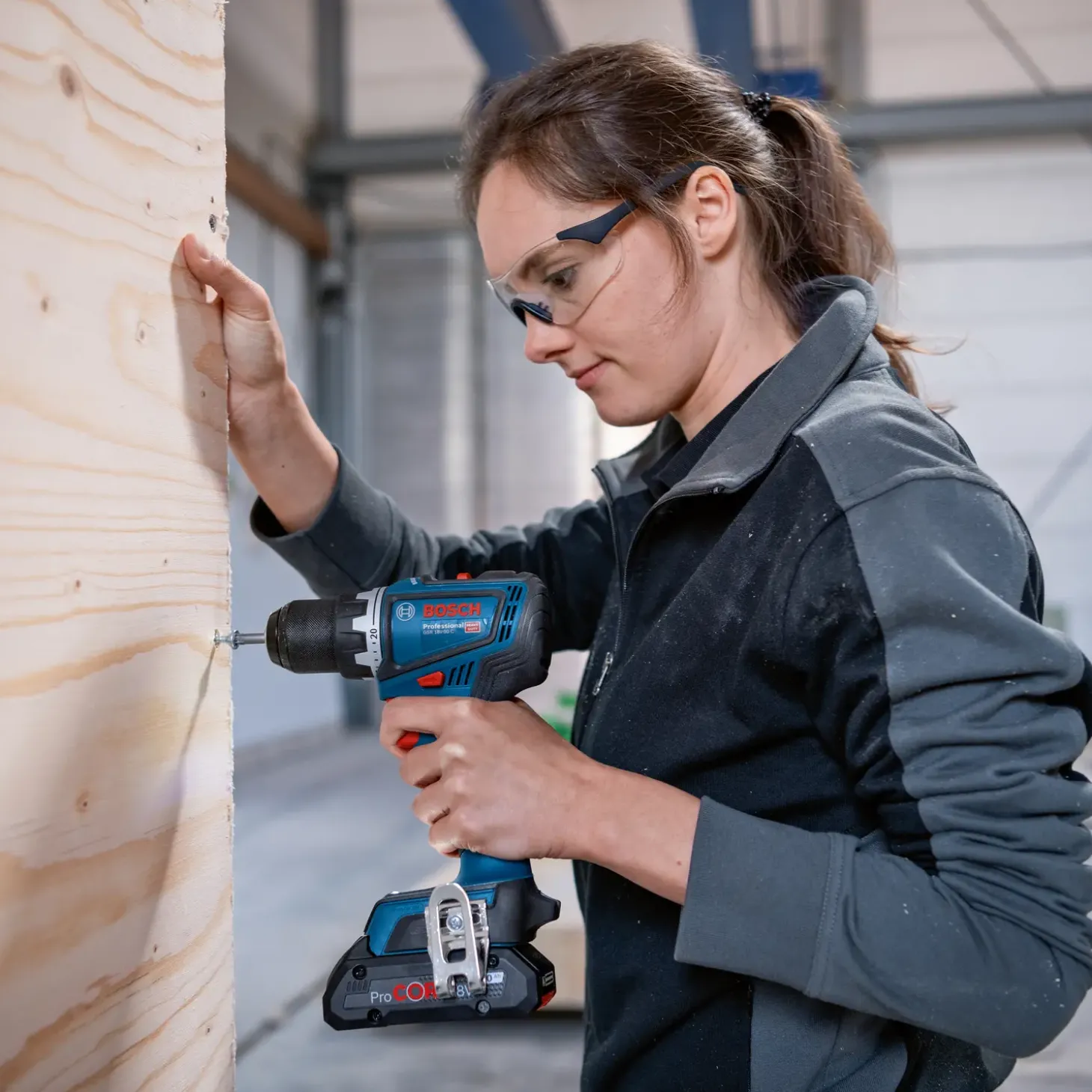 Kraftfuld professionel bore-/skruemaskine fra Bosch til krævende opgaver, lang arbejdstid med 18V 4.0 Ah ProCorre batterier.