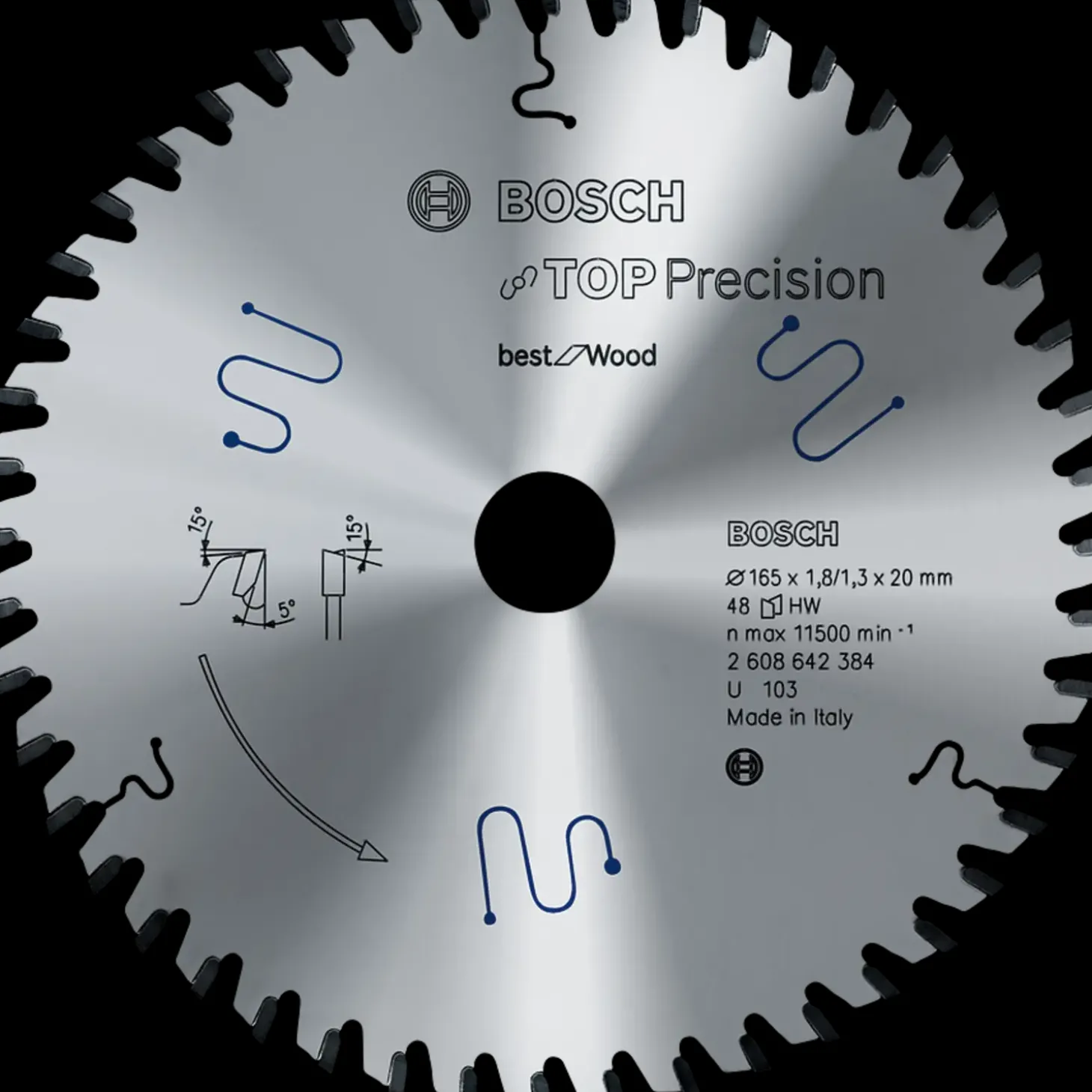 Rundsavsklinge Top Precision Best for WoodKrævende opgaver – Best for Wood rundsavsklingen leverer industriel kvalitet og klarer meget krævende opgaver i træ. Dens specielle Extra Hard Microteq-tænder er fremstillet internt af Bosch og består af ekstra holdbare hårdmetalkorn, der giver en høj skæreevne. Den høje kvalitet forbedres også af klingens Cleanteq-coating, der modvirker reducerer fastklæbning af rester af f.eks. lim og harpiks og sikrer ekstra rene resultater. Samtidig holder denne coating klingen kølig og beskytter den mod korrosion. Desuden er klingen forsynet med polyurethanfyldte Stabilteq-antivibrationshuller, der markant reducerer vibration og støj, så det bliver nemt og komfortabelt at skære præcist. Savklingen er beregnet til brug i alle slags træmaterialer. Den er kompatibel med dyksave og håndholdte save. Afhængigt af antallet af tænder kan der opnås forskellige resultater med alle Best for Wood rundsavklinger, der har ATB-tandgeometri (Alternate Top Bevel): Når klingen er forsynet med et højt antal tænder, giver den rene snit, hvorimod et lavt antal tænder giver kraftfulde, effektive snit. Boringen fungerer med eller uden reducerringe, så de passer til forskellige størrelserIndustriel kvalitet til ekstra krævende opgaver i træExtra Hard MicroteQ-tænder er fremstillet internt af Bosch af ekstra holdbare karbidkorn, der giver en høj skæreevneCleanteq-coating modvirker fastklæbning af rester, sikrer helt rene resultater uden korrosion og holder bladet køligtPolyurethanfyldte Stabilteq-antivibrationshuller reducerer vibration og støj og gør det nemt at skære med præcisionUdvendig diameter mm: 165Boring mm: 20Skærebredde (b1) mm/stamklingetykkelse (b2) mm: 1,8/1,3Antal tænder: 48Tandform: ATBMaks. rotationshastighed (o/min): 11500Snitresultat: 4Spånvinkel ° α: 5Frivinkel ° β: 15