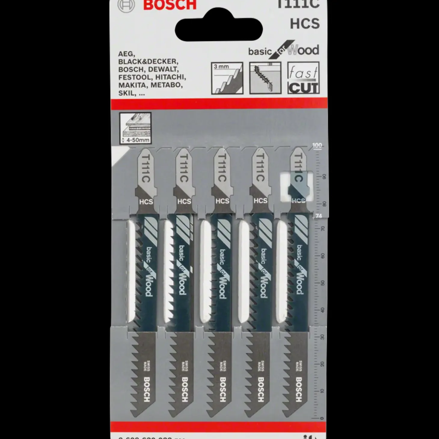 Stiksavklinge T 111 CSavning i blødt træ – T 111 C Basic for Wood stiksavklingen giver lige snit i træ. Dens fræsede udlagte tandform er ideel til snit uden særlige krav. Bladets HCS-materiale (kulstofrigt stål) er egnet til blødt træ og ikke-abrasive træbearbejdningsmaterialer. En mellemhøj tandhøjde (3 mm) gør det muligt for klingen at save i træbearbejdningsmaterialer med en tykkelse på 4-50 mm. Til brug sammen stiksave med fastgørelsessystemer med T-skaft. Passer til alle stiksave med T-holderSnit i blødt træ og ikke-abrasive træbearbejdningsmaterialerFræset udlagt tandform er ideel til snit uden særlige kravHCS-materiale (kulstofrigt stål) er egnet til savning i blødt træ og ikke-abrasive træbearbejdningsmaterialerMellemhøj tandhøjde (3 mm) saver tykke træmaterialer med en tykkelse på 4-50 mmMateriale: HCSTandudførelse: Udlagt, fræsetSamlet længde [mm]: 100Tanddeling [mm]: 3,0Anvendelsesområder: Blødt træ (4-50 mm), spån-, møbel-, fiberplader, hurtigt snitAnbefalet min. materialetykkelse [mm]: 4Anbefalet max. materialetykkelse [mm]: 50Type: T 111 C