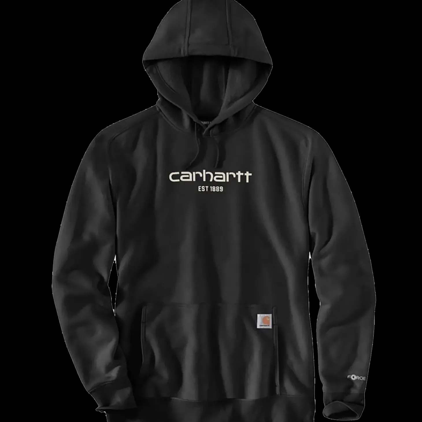Denne Carhartt force logo sweatshirt er udviklet med teknologi Force. Det betyder at hættetrøjen er svedtransporterende, hurtigtørrende og smudafvisende. Den forhindre lugt med anti-mikrobielle egenskaber, så du kan svede i den uden at lugte. Du finder en tredelt hætte med justerbar snorelukning, to frontlommer med skjult telefonlomme som kan bruges som håndvarmere. Der sidder en Carhartt logo trykt på brystet samt en lille Carhartt label syet på lommen foran. Denne sweatshirt er desuden god hvis det blæser udenfor, da der er ribstrikkede manchetter samt taljebånd. Med andre ord, forhindrer den vinden i et trænge igennem ved de udsatte områder.