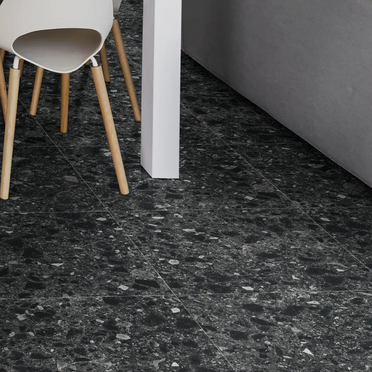 Ceppo di Gré er en grå stenart som indeholder en masse mindre sten. Ceppo di Gré skaber, med sine mange små sten og grå nuancer, et abstrakt mønster på gulvet.