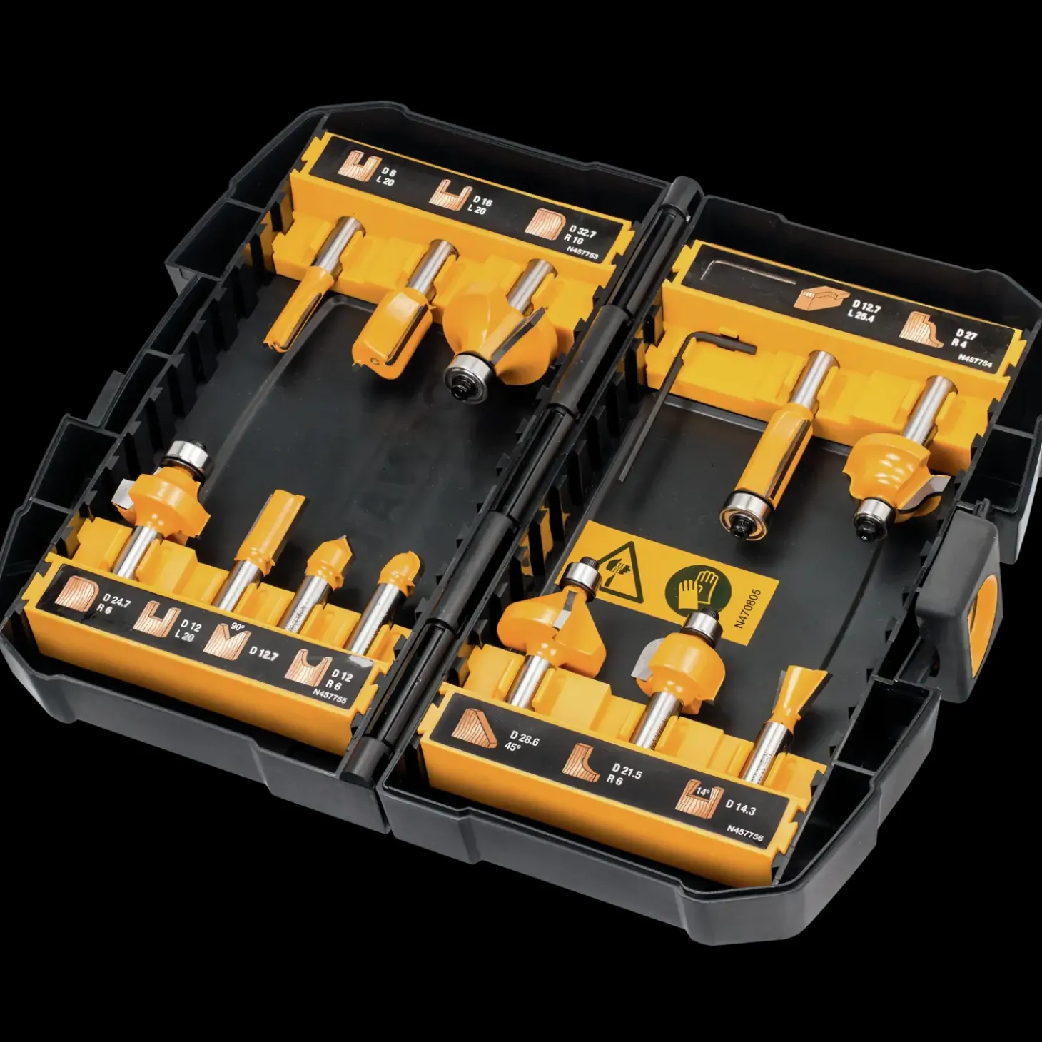 Sættet med fræsejern kommer med forskellige fræsejern, som bl.a. er velegnet til dyb falsning, boring af dybe taphuller, samt fræsestål med en kanal til hurtig boring og én med to skær til perfekt finish.