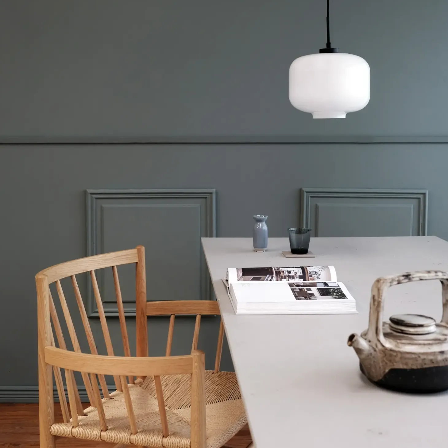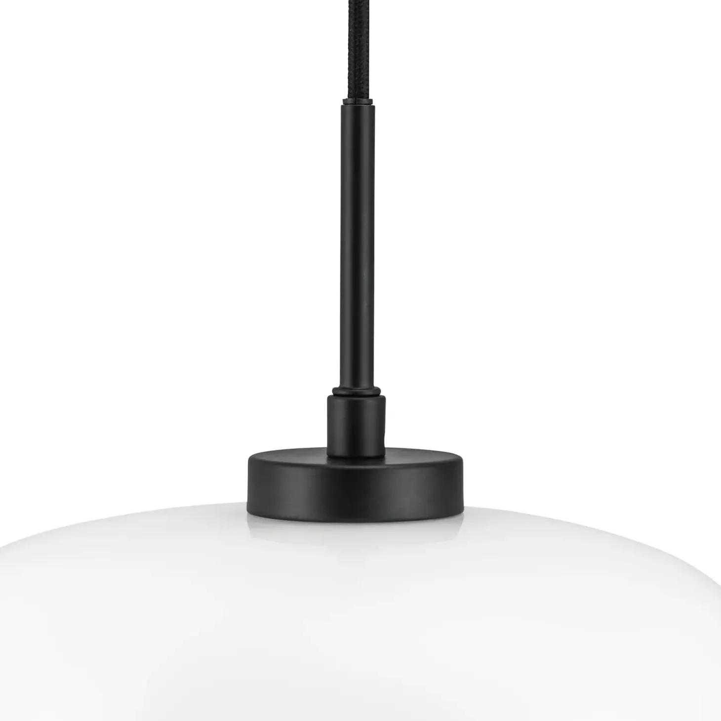 ARP pendel har en lampeskærm i hvidt opalglas. Det er en klassisk model som kan indgå alle alle miljøer, moderne som klassisk. Ophænget er i mat sort metal og ledningen i sort stof. Rosette mod loftet er i samme matte sorte metal som ophænget. Den er nem at montere og justere.