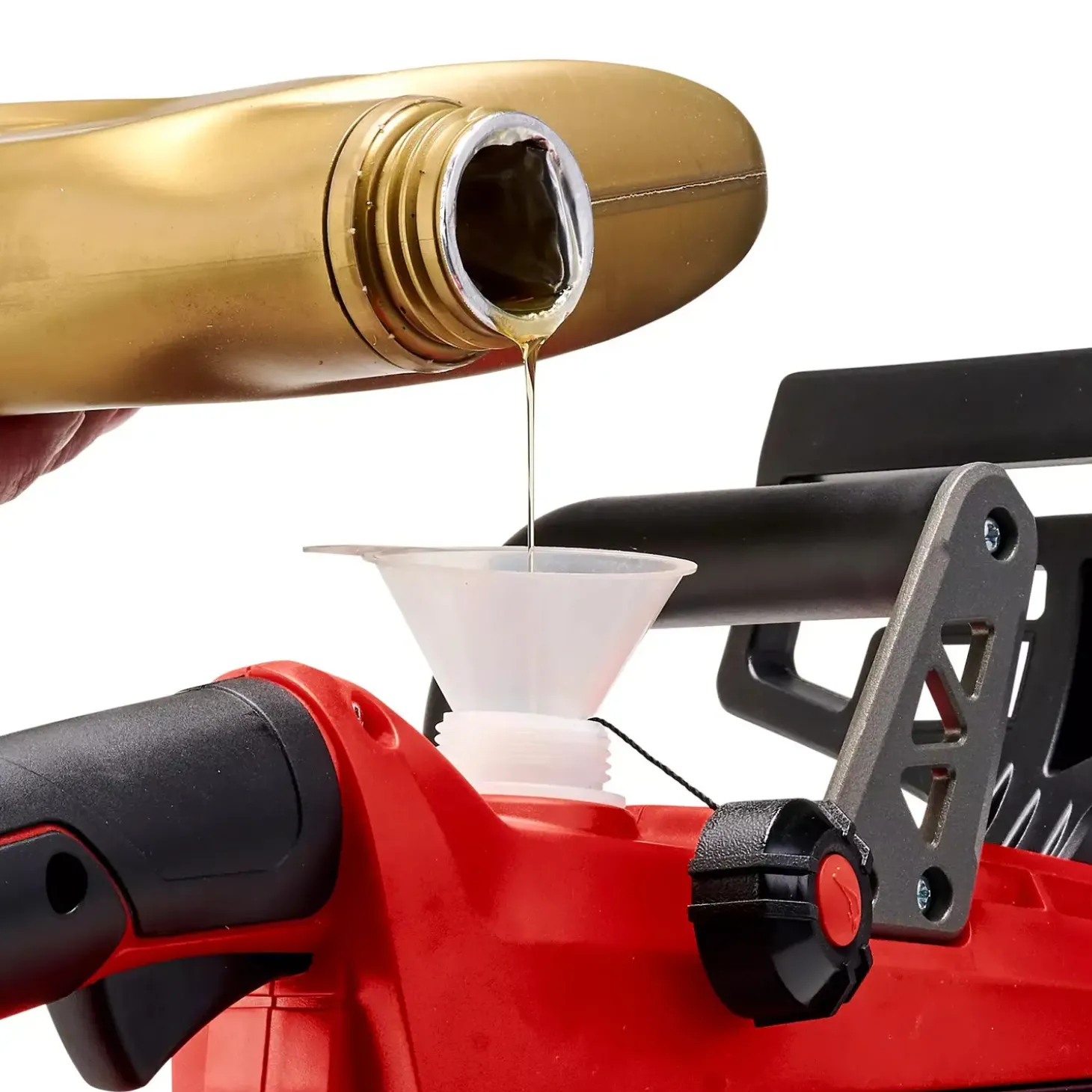 Det ergonomiske håndtag giver dig et behageligt og fast greb om akku-kædesaven. Kæden kan strammes eller skiftes uden brug af værktøj. Kæden smøres automatisk. Den store åbning på olietanken gør det unødvendigt at bruge en tragt. Dette produkt leveres uden batteri og lader.