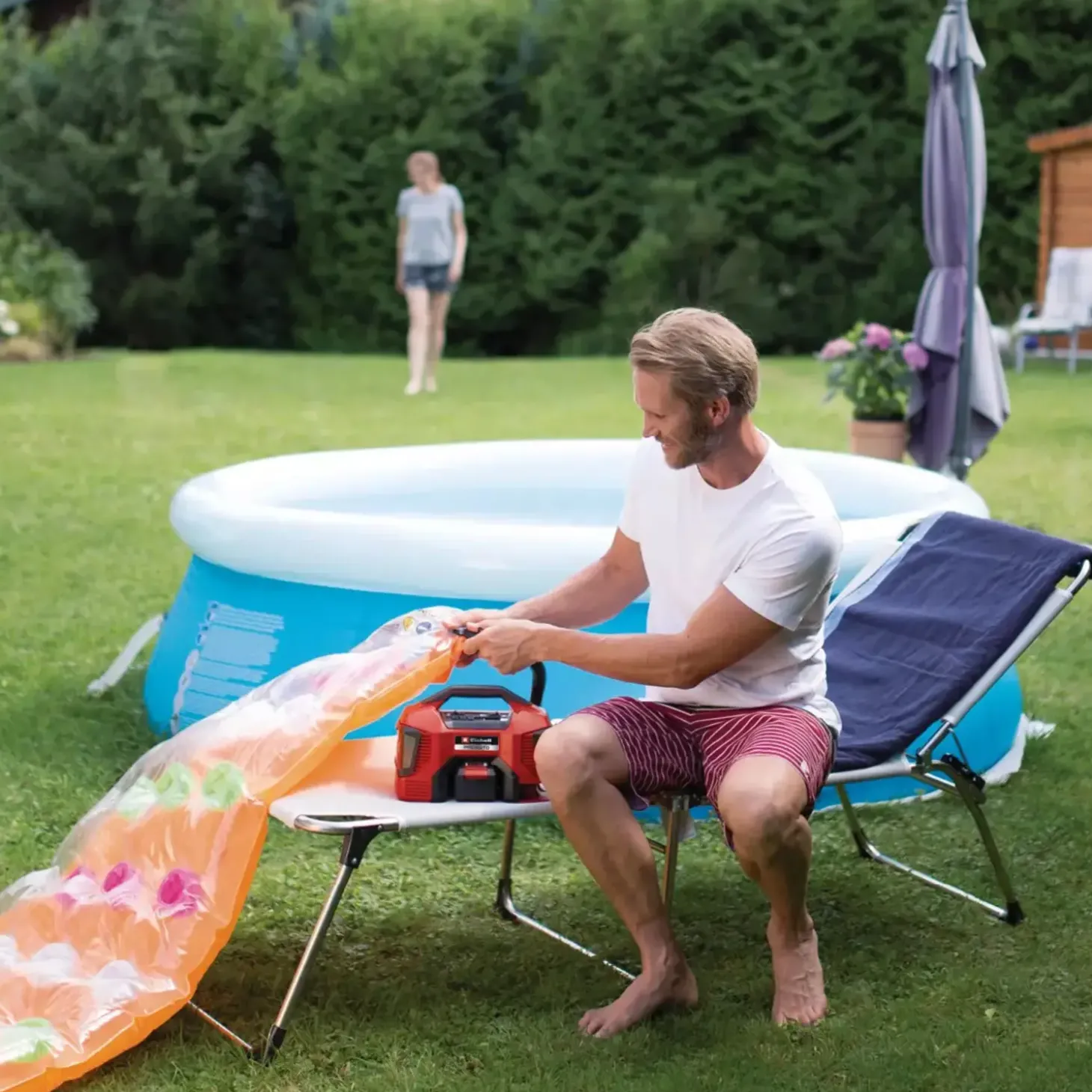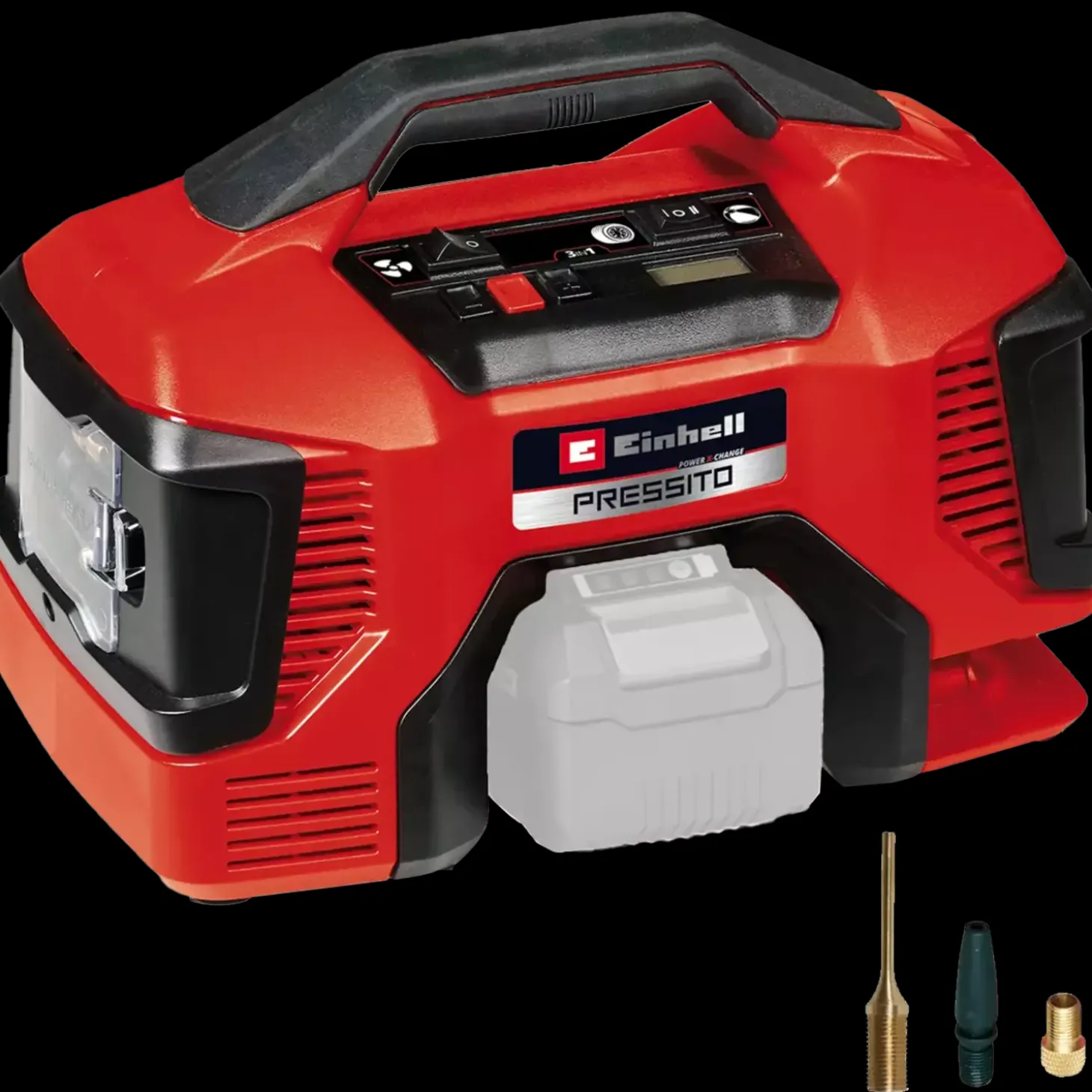 Du kan vælge mellem måleenhederne bar, psi og kPa til trykmåling. Det ønskede tryk kan indstilles ved brug af højtrykspumpen. Af andre praktiske funktioner kan nævnes automatisk slukning ved opnåelse af indstillet tryk og en knap til højtryksoppumpning uden forudindstillet tryk. Akku-kompressoren er udstyret med et opbevaringsrum til adaptersættet i 3 dele. Til drift af maskinen kræves en 18-V-akku. Leveres uden akku og oplader. Disse fås separat, f.eks. som praktisk Einhell startsæt.