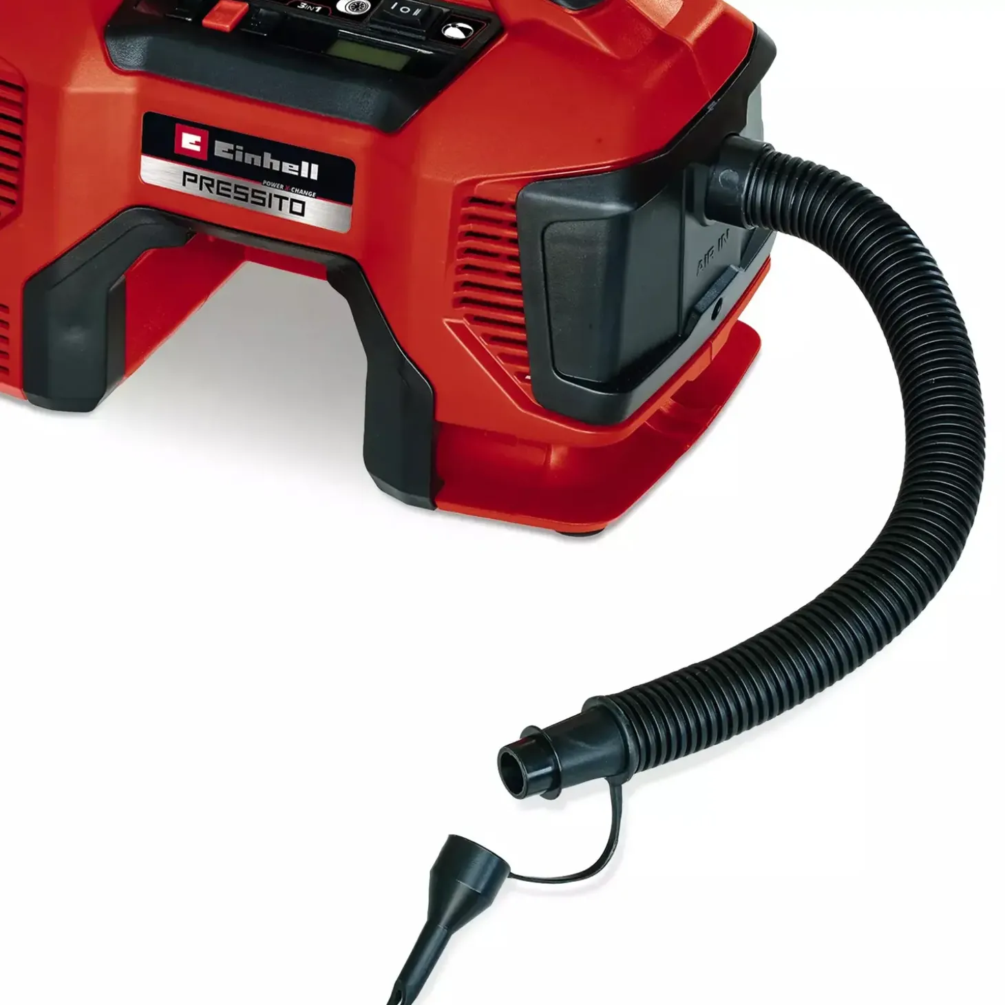 Einhell akku-kompressor Pressito 18/21 mister aldrig pusten. Hvad enten du skal pumpe luft i noget eller fjerne den igen, er der mange anvendelsesmuligheder. Kompressoren indgår i Power X-Change-familien: PXC-akkuen kan anvendes i alle systemfamiliens maskiner.