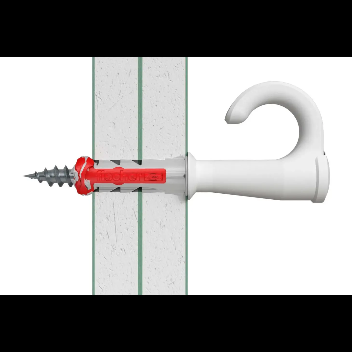 Den innovative EasyHook Løkke forvandler skruer til øjekroge. Det krogformede tilpasningsstykke kobles til den undersænkede skrue og monteres hurtigt og sikkert med DuoPower. Takket være den glasfiberforstærkede nylon, kan krogen tåle høje belastninger og sikrer et fast hold.