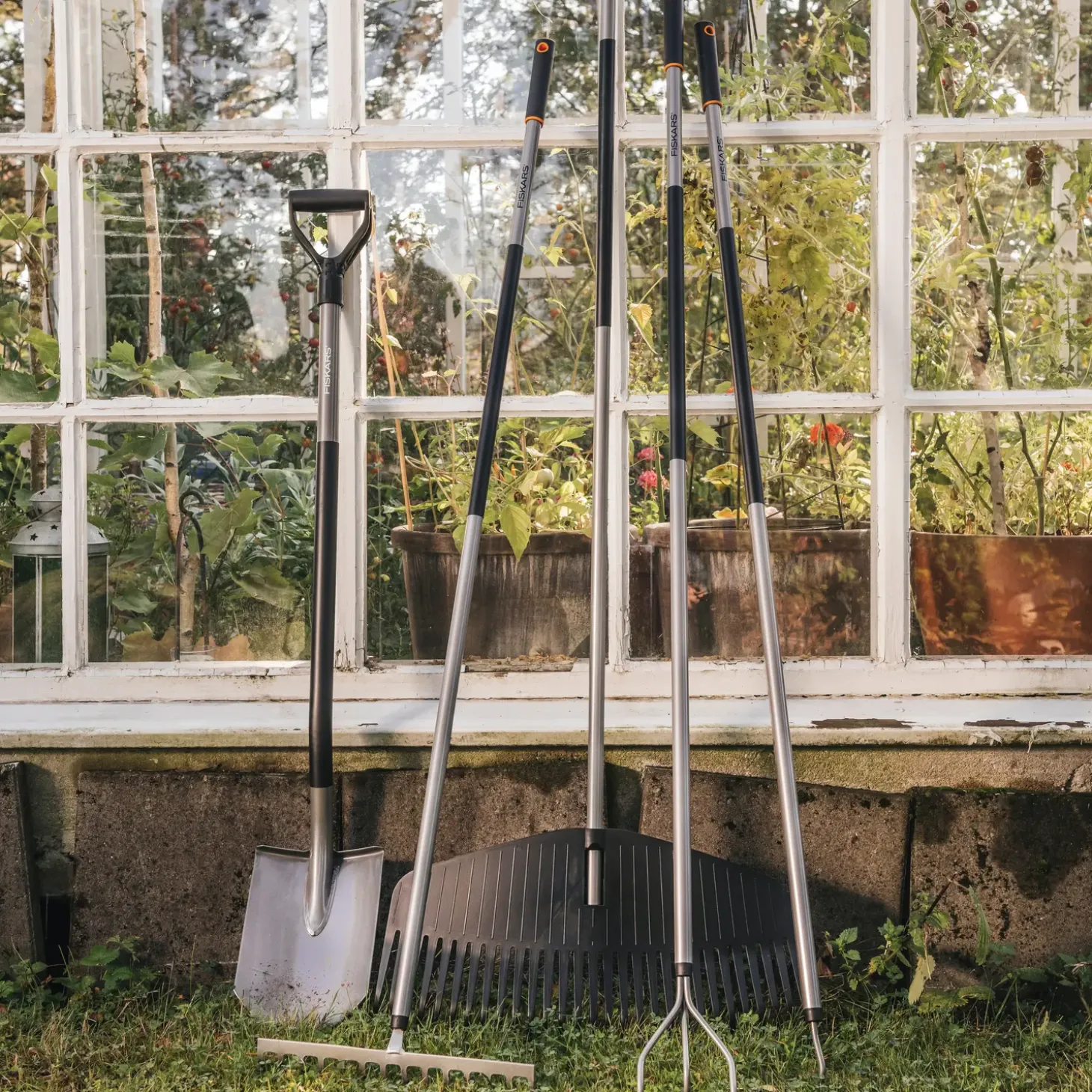 12 tands riven fra Fiskars ergonomi serie er specielt udformet til at mindske belastningen af din krop under havearbejdet så du kan nyde frugten af arbejdet når du slapper af på terrassen efter en dag i haven. Vinkelen på det S-formede ergonomiske skaft aflaster ryg og skuldre og det bløde skridsikre plasthåndtag er behageligt at have i hænderne.12 tands riven er særdeles velegnet til jævning af jorden efter kultivering og lugning af jorden.