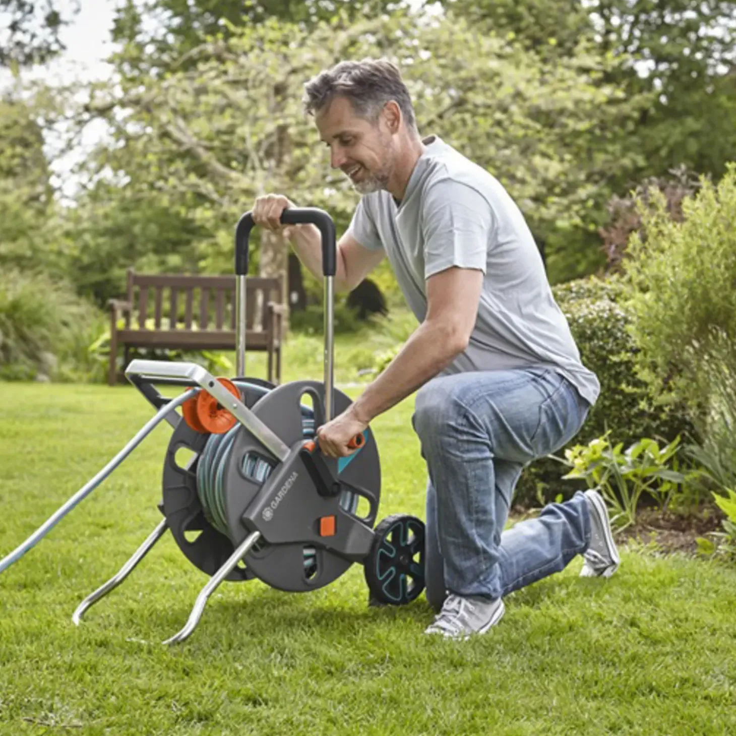 Gardena AquaRoll L Easy smart komplet slangevogn klar til brug, sættet består af haveslange, rengørings dyse og slangekobling.