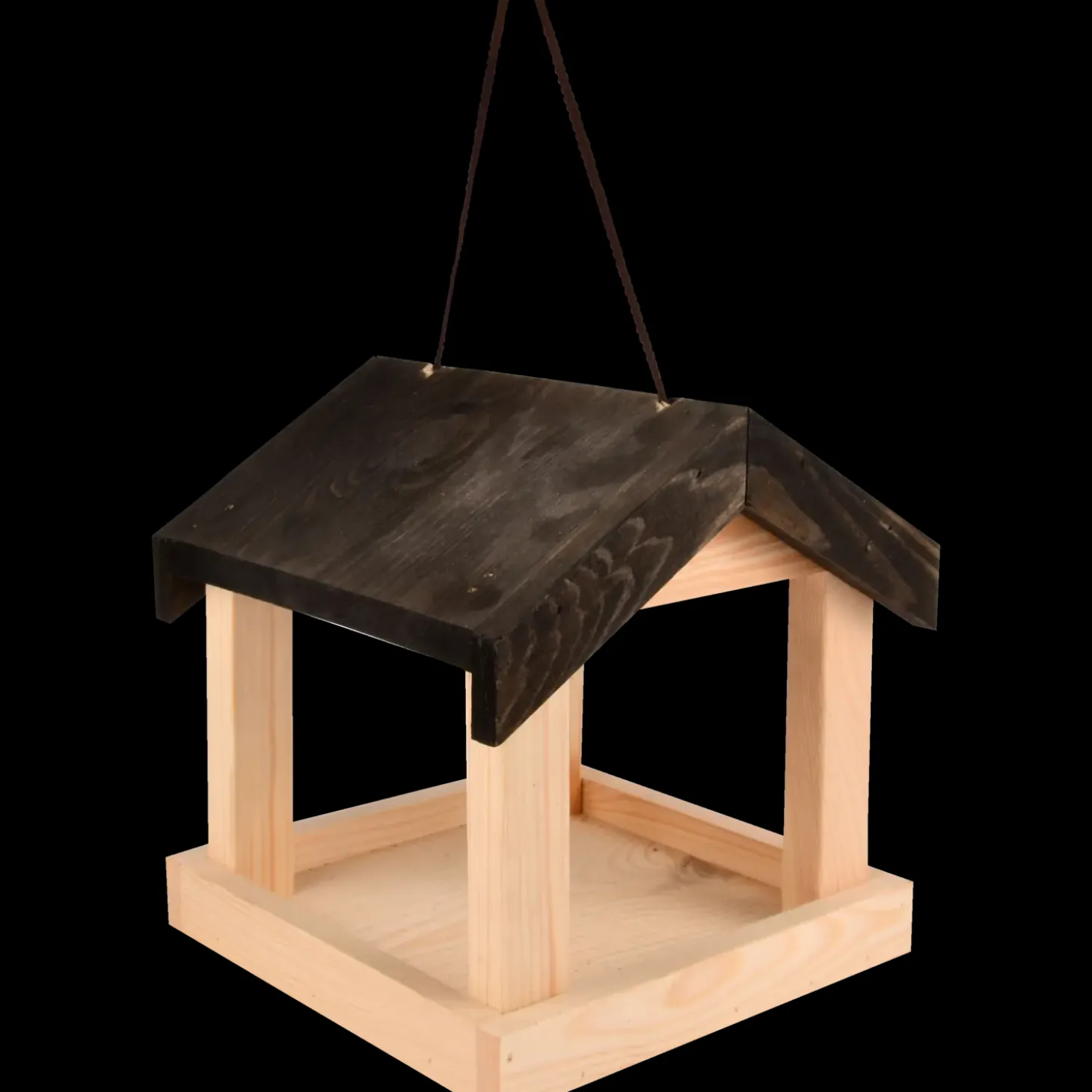 Klassisk foderhus i træ natur med sortmalet tag. Dette foderhus er beregnet til vægophæng.