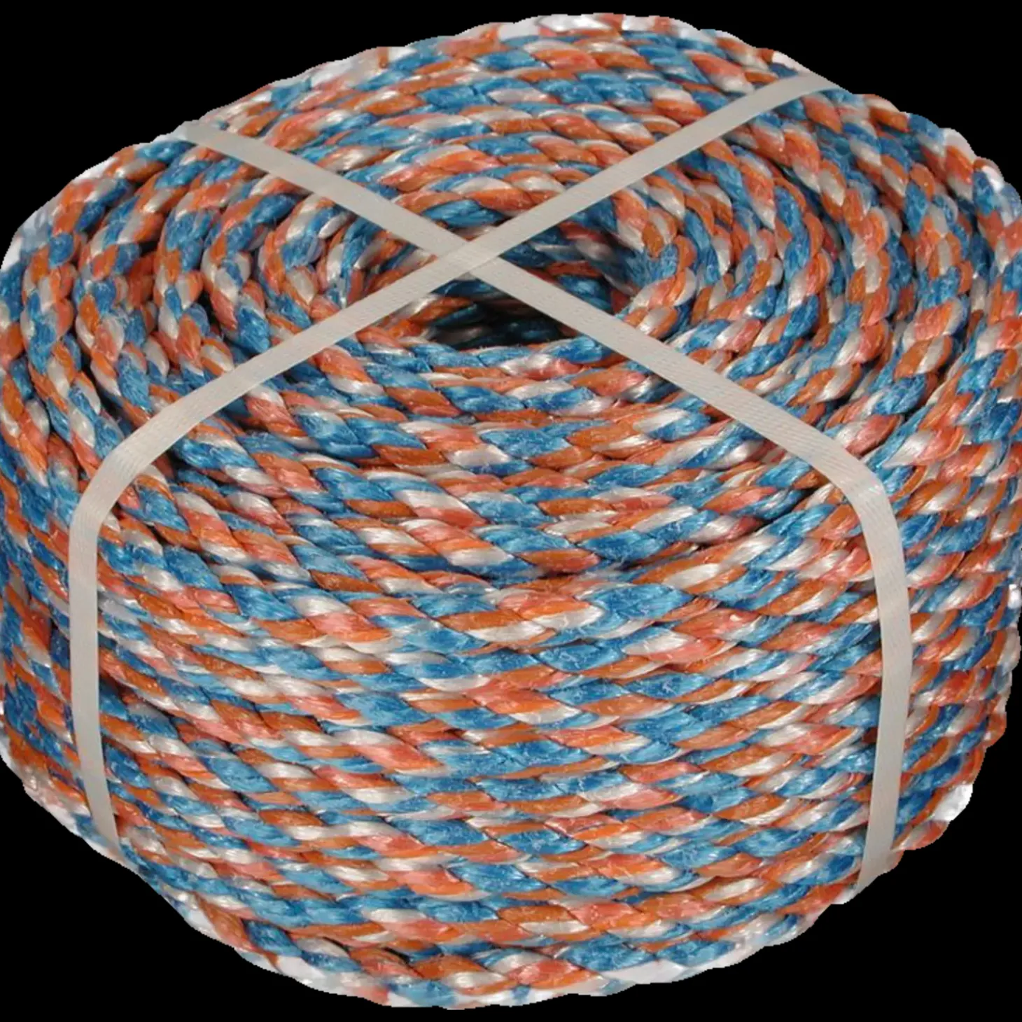 Flexreb/landbrugsreb med 3-slået i ruller, der måler +/-45 m x 9 mm med en brudstyrke på cirka 1000 kg.