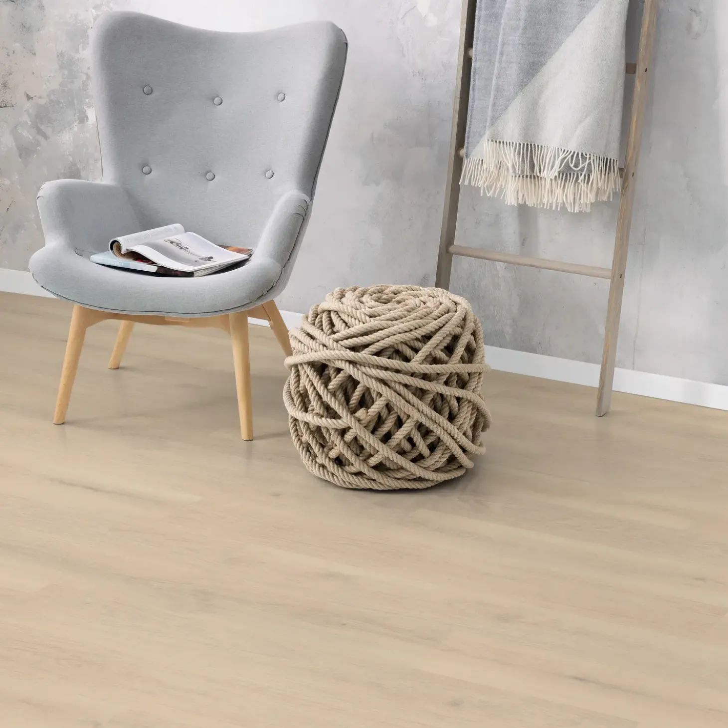 Flot, lyst laminatgulv gulv i 8 mm og med brugsklasse 32 i Classic format 193 mm x 1292 mm. Gulvet er velegnet til alle boligens rum på nær vådrum.