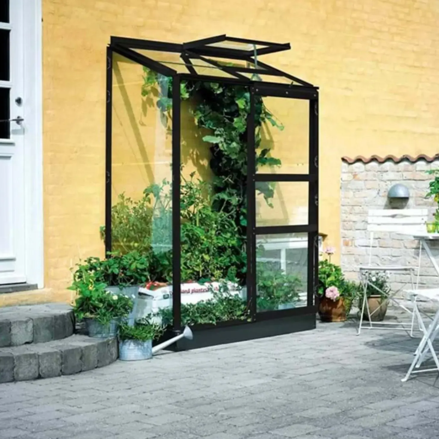 Størrelsen på drivhuset 0,91 m2 gør det muligt at skabe en grøn oase med plads til egen lille køkkenhave, uanset om du har en lille altan eller en lidt større terrasse. Du kan med fordel anvende drivhuset som et vægdrivhus, da planterne nyder godt af den varme som væggen afgiver.